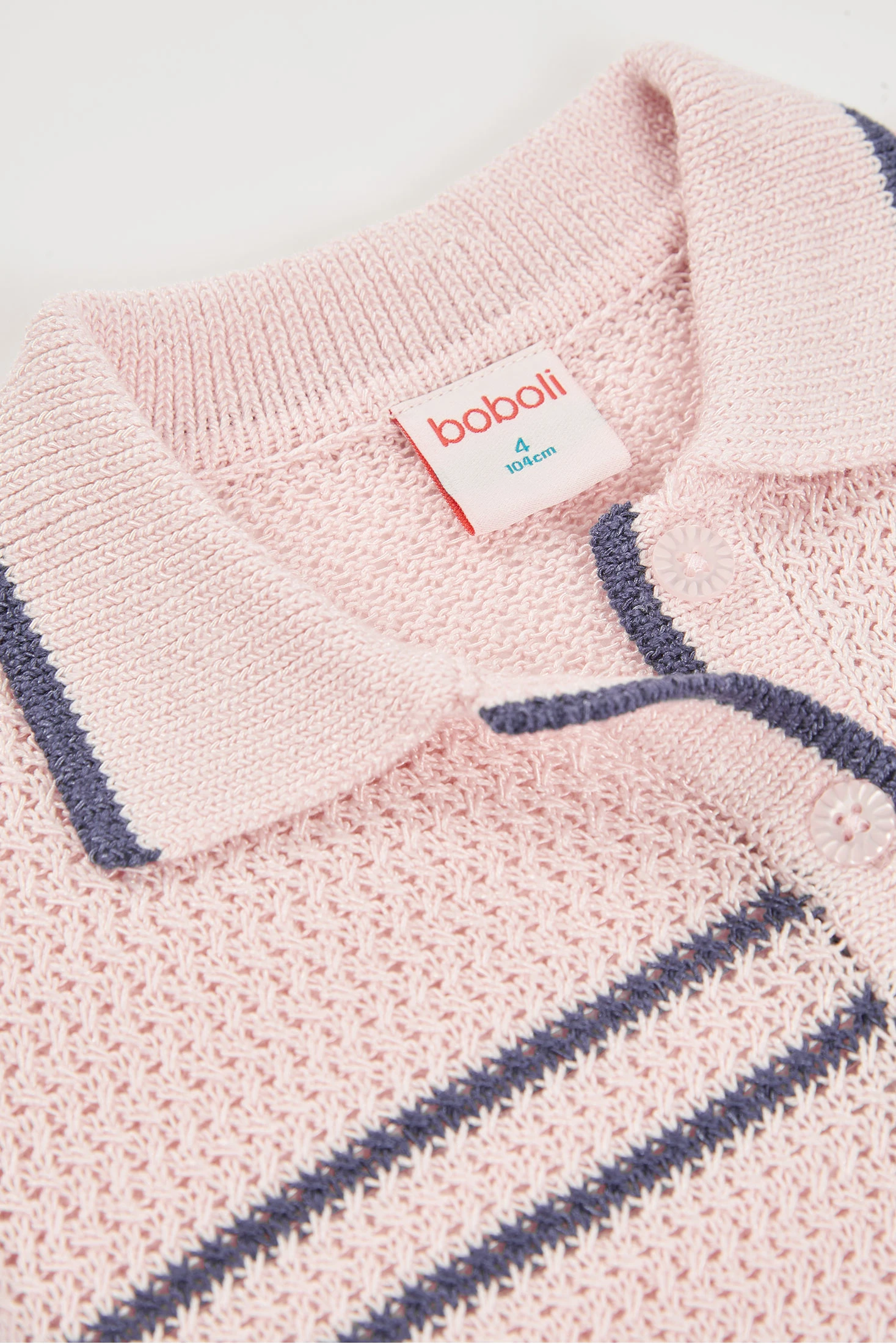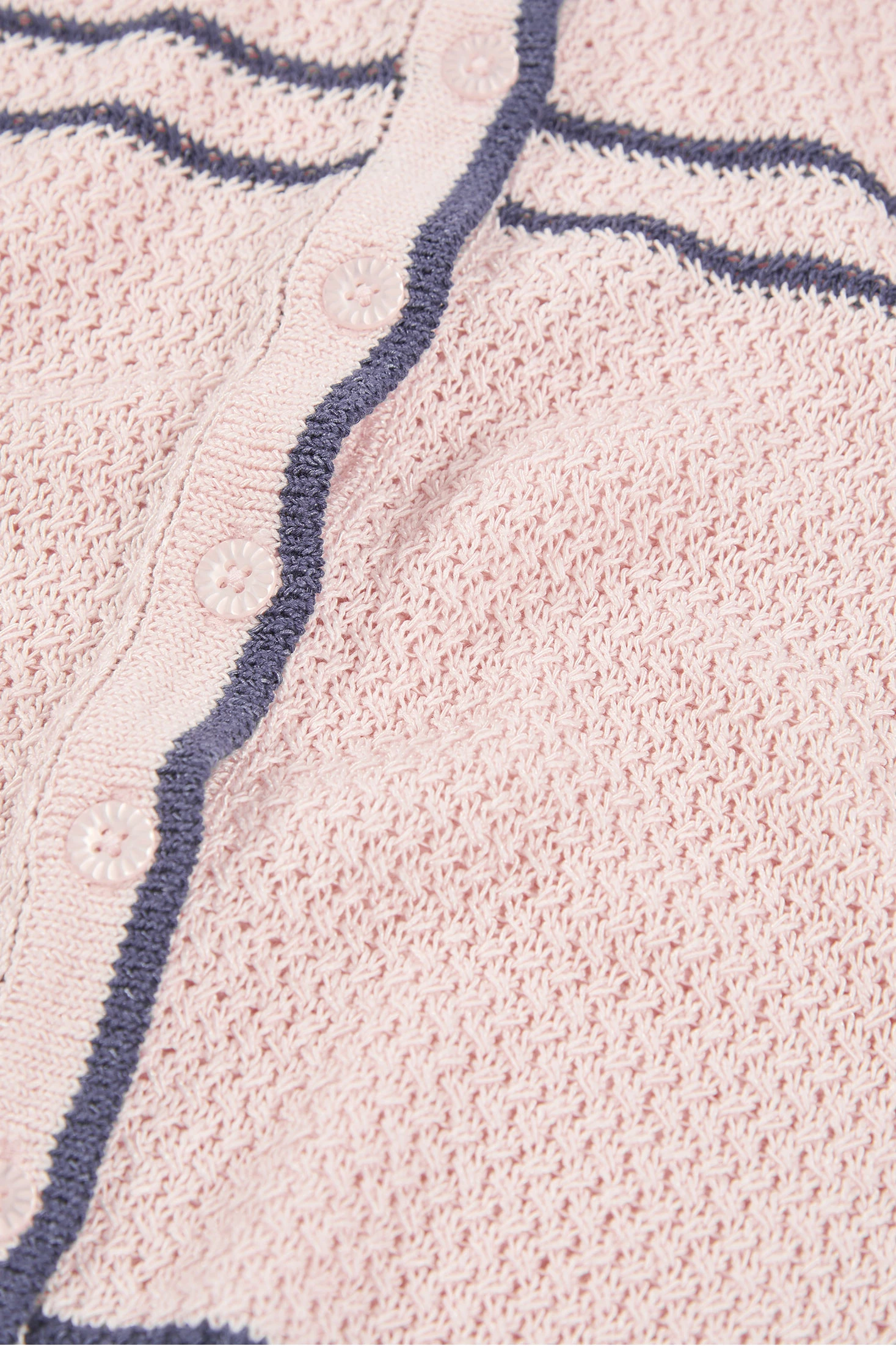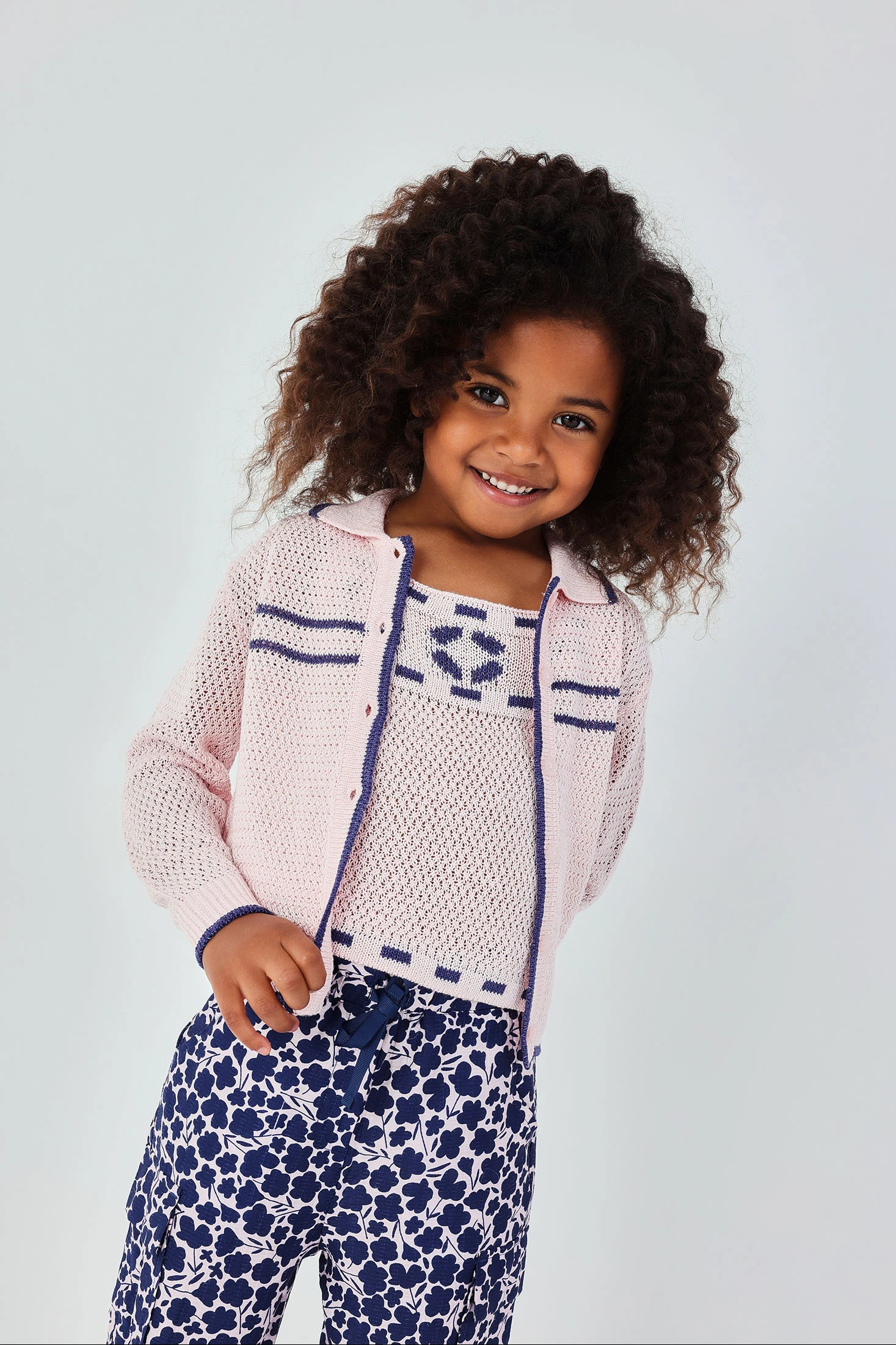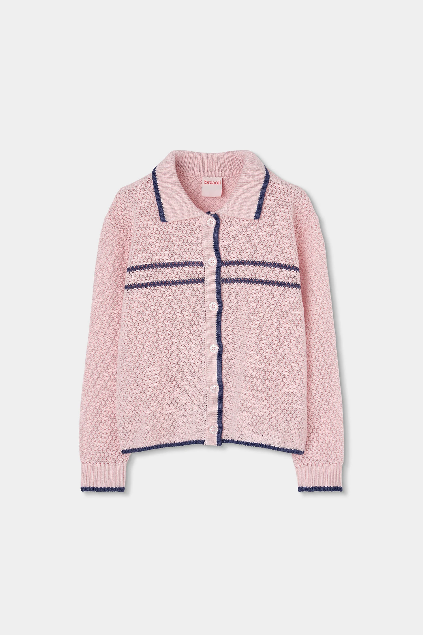 Chaqueta de tricotosa rosa para niña ideal para la temporada de primavera. Hecha de tejido suave, ofrece calidez y comodidad. Presenta un diseño con botones en la parte delantera y detalles en azul marino en el cuello y puños que aportan un toque elegante. Es perfecta para ocasiones casuales y se puede combinar fácilmente con pantalones o faldas. Disponible en tallas desde 12 meses hasta 10 años, es una prenda versátil y funcional que se adapta al estilo diario de cualquier niña.
