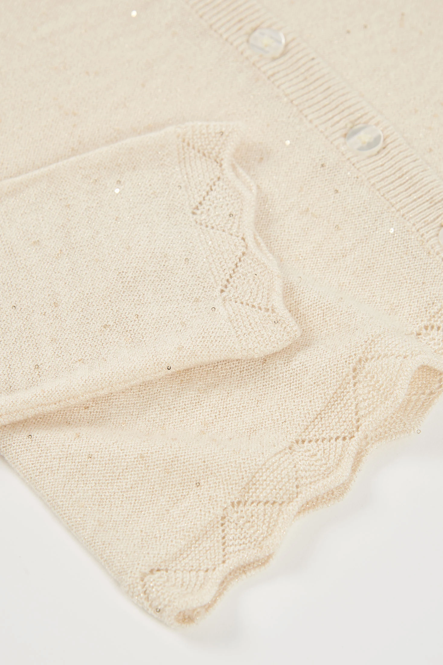 Chaqueta de punto para niña ideal para la primavera y el verano. Confeccionada en tejido de punto color blanco roto, ofrece calidez y comodidad. El diseño incluye botones al frente y un borde ondulado que añade un detalle elegante. Disponible en tallas desde 12 meses hasta 10 años. Su color neutro permite combinarla fácilmente con diferentes atuendos, haciendo de esta prenda una opción versátil y práctica para el guardarropa infantil.