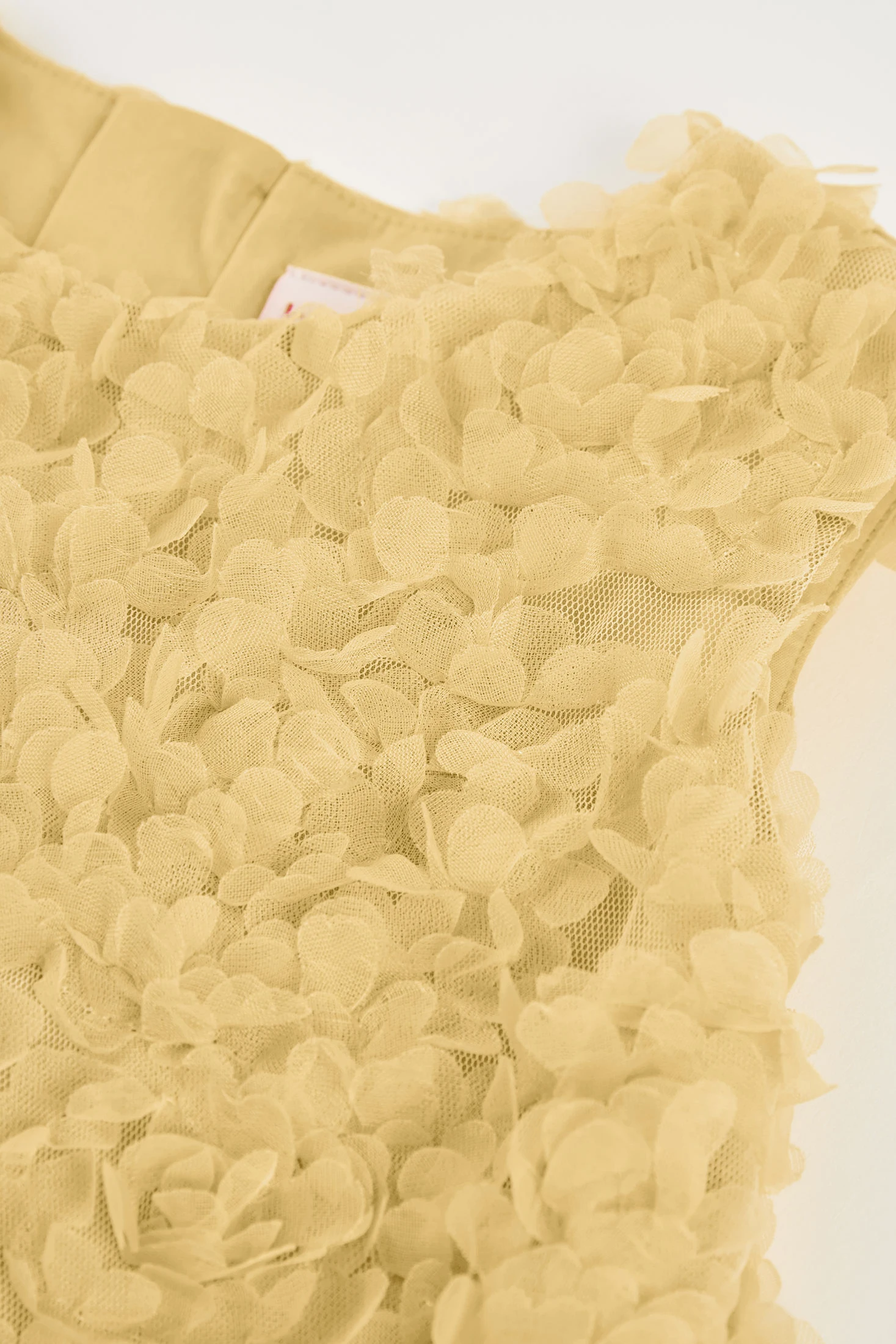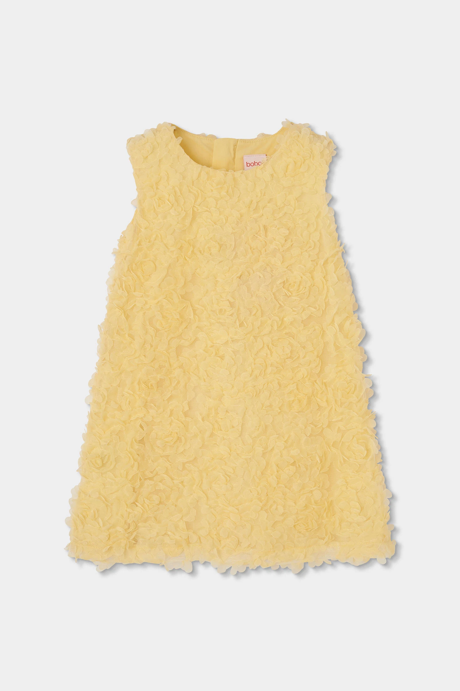 Vestido de tul amarillo ideal para niñas en ocasiones especiales. Con un diseño sin mangas y una textura floral bordada por toda su superficie del vestido, ofrece un estilo alegre y sofisticado. Hecho de material ligero, proporciona comodidad y libertad de movimiento. Disponible en tallas desde 12 meses hasta 10 años. Su llamativo color amarillo y diseño texturizado lo convierten en una pieza perfecta para fiestas y eventos, añadiendo un toque de elegancia y frescura al guardarropa de cualquier niña.