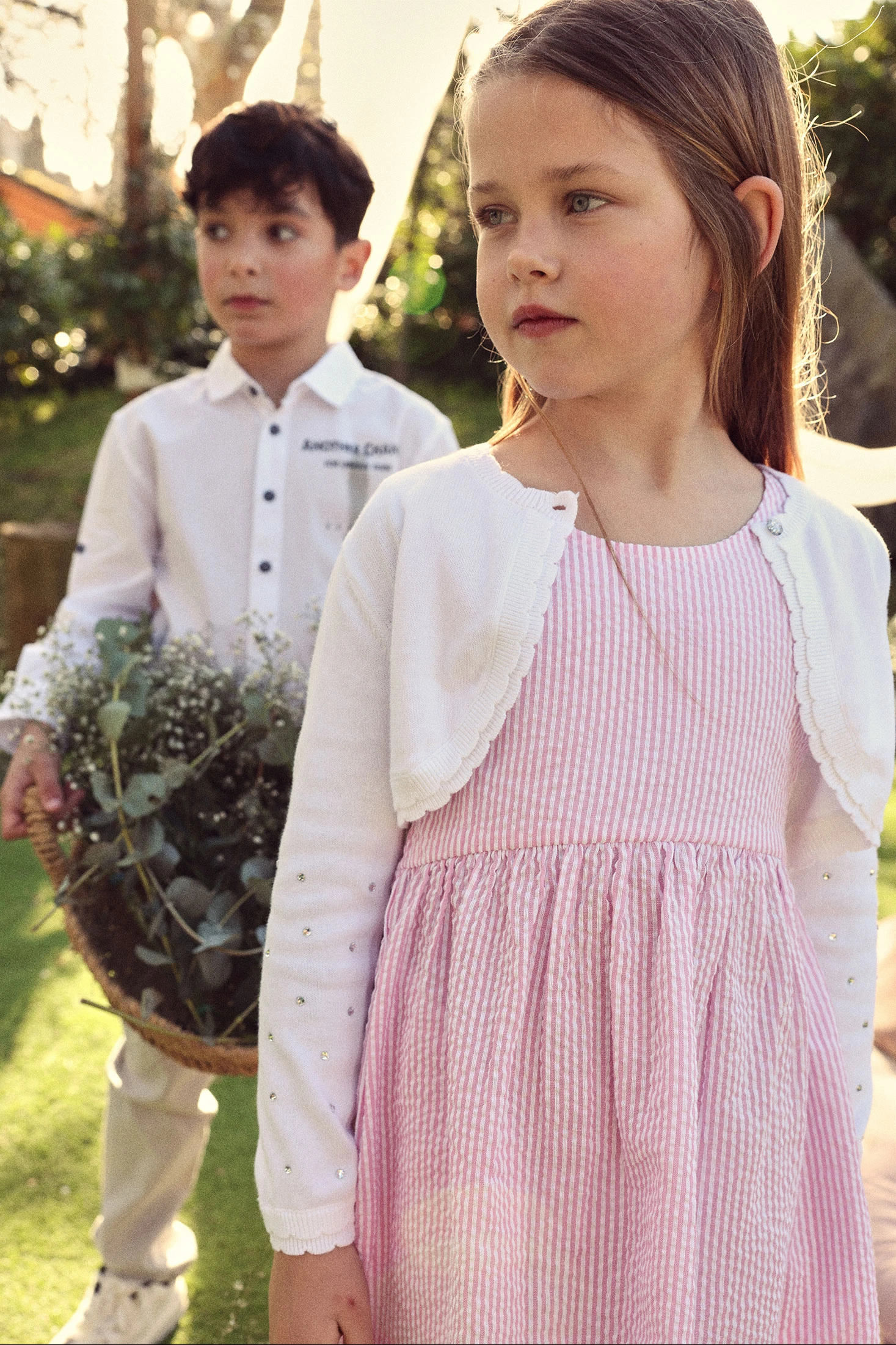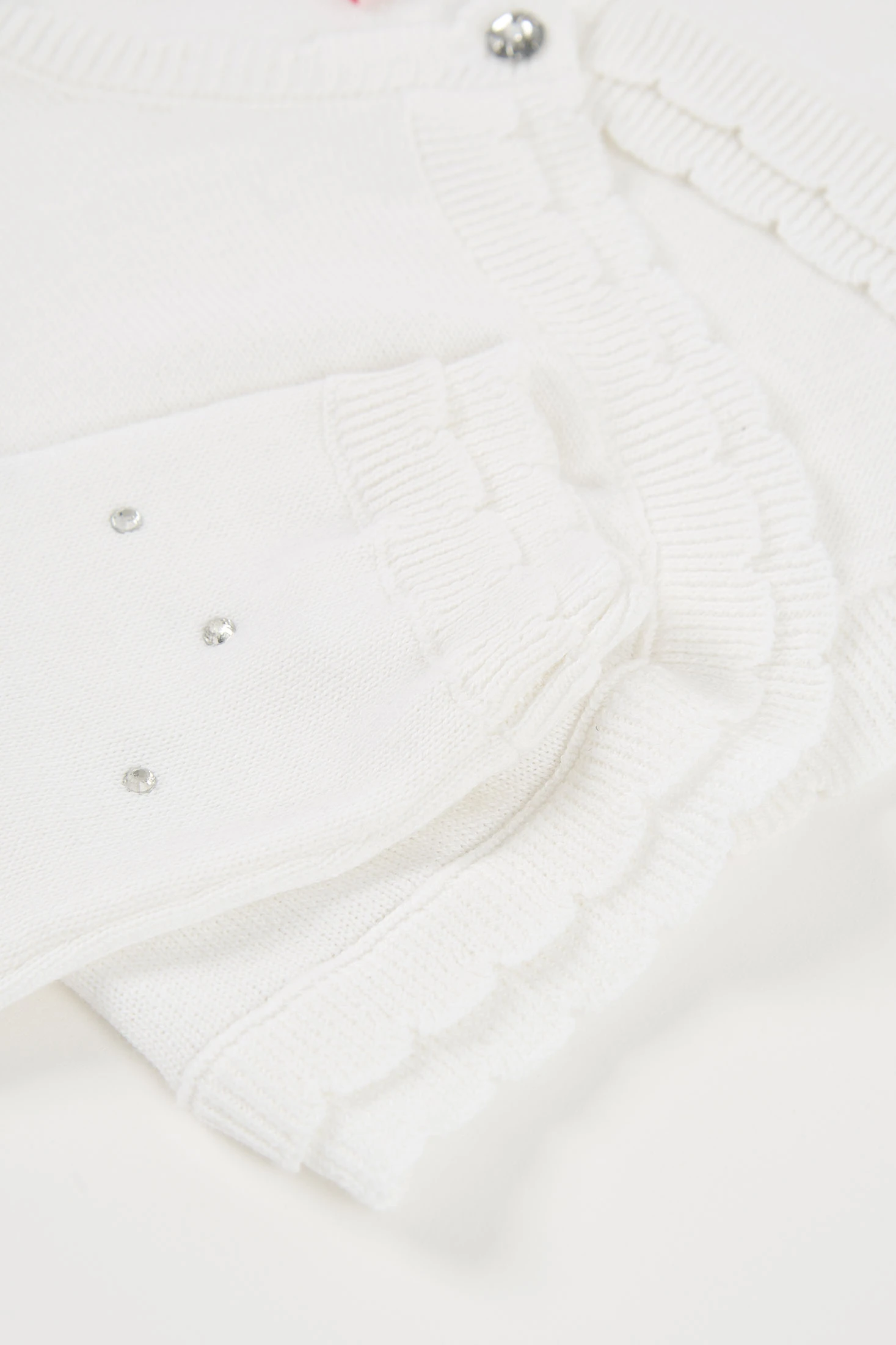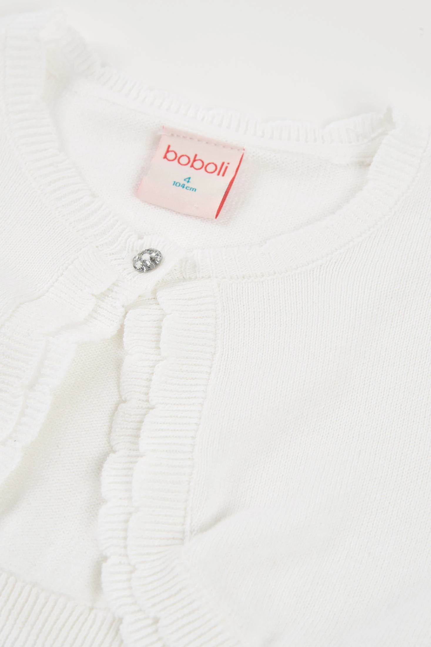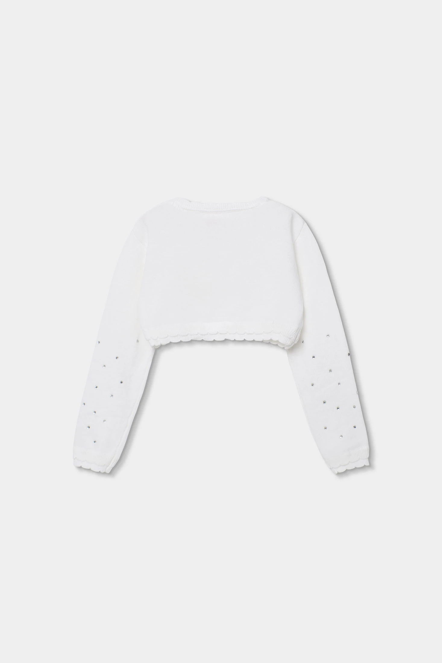 Chaqueta de punto para niña ideal para la temporada de otoño e invierno. Su tejido suave y cómodo proporciona calidez, con un elegante color blanco que la hace versátil para cualquier ocasión. El diseño presenta detalles bordados delicados en las mangas largas, perfectos para añadir un toque chic. Disponible en tallas desde 12 meses hasta 10 años. Perfecta para combinar con vestidos o pantalones, añadiendo un toque elegante a cualquier conjunto.