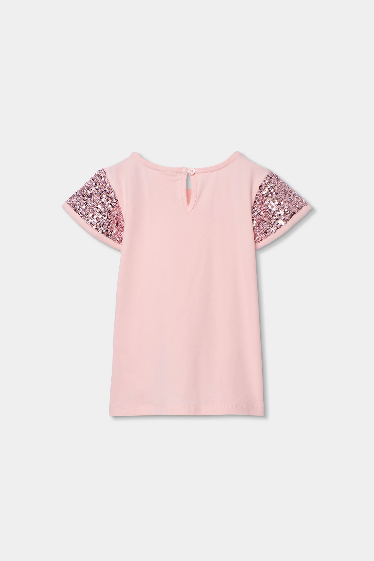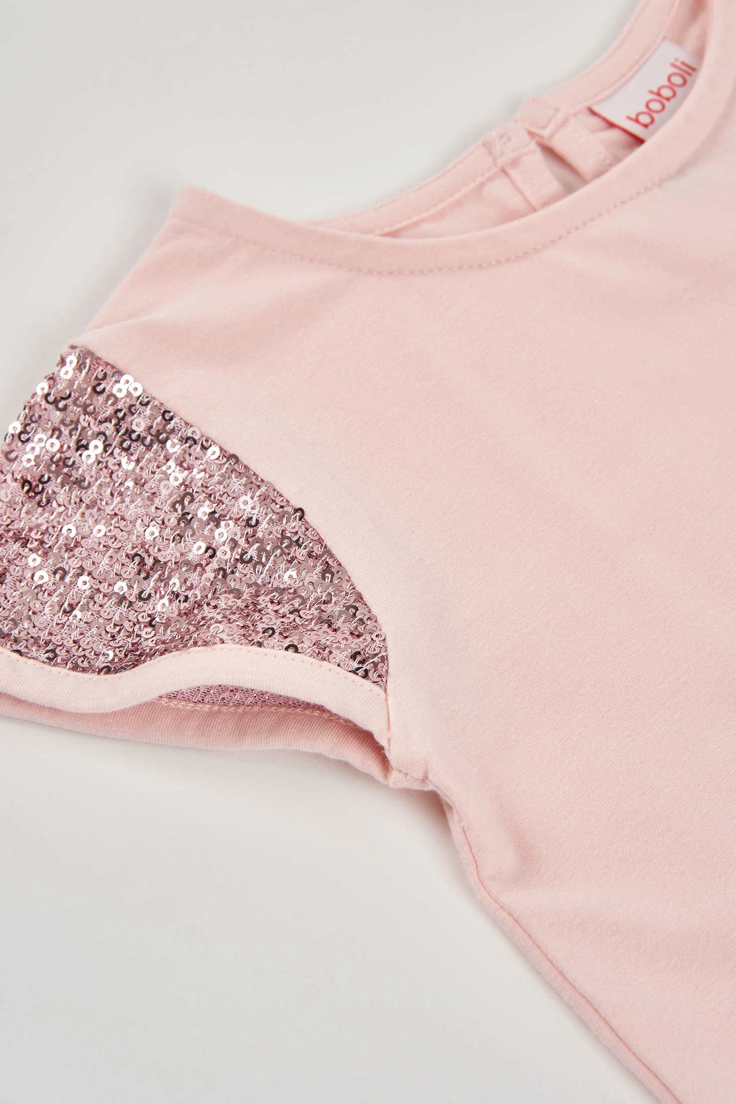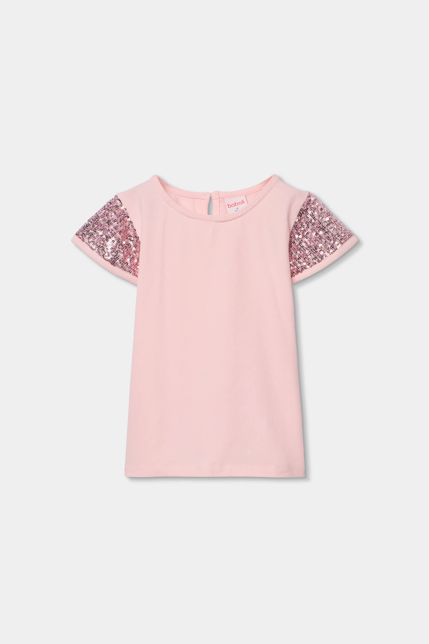 Camiseta de punto rosa para niña, ideal para cualquier ocasión. Fabricada con un tejido suave y cómodo, presenta mangas cortas adornadas con lentejuelas que le aportan un toque de estilo. Su diseño básico y color femenino la hace perfecta para combinar con diversas prendas. Disponible en tallas desde 0 meses hasta 12 años, adaptándose al crecimiento de la niña. Cuello redondo que facilita su colocación y es una opción versátil para el día a día, adecuada tanto para el juego como para salidas informales.