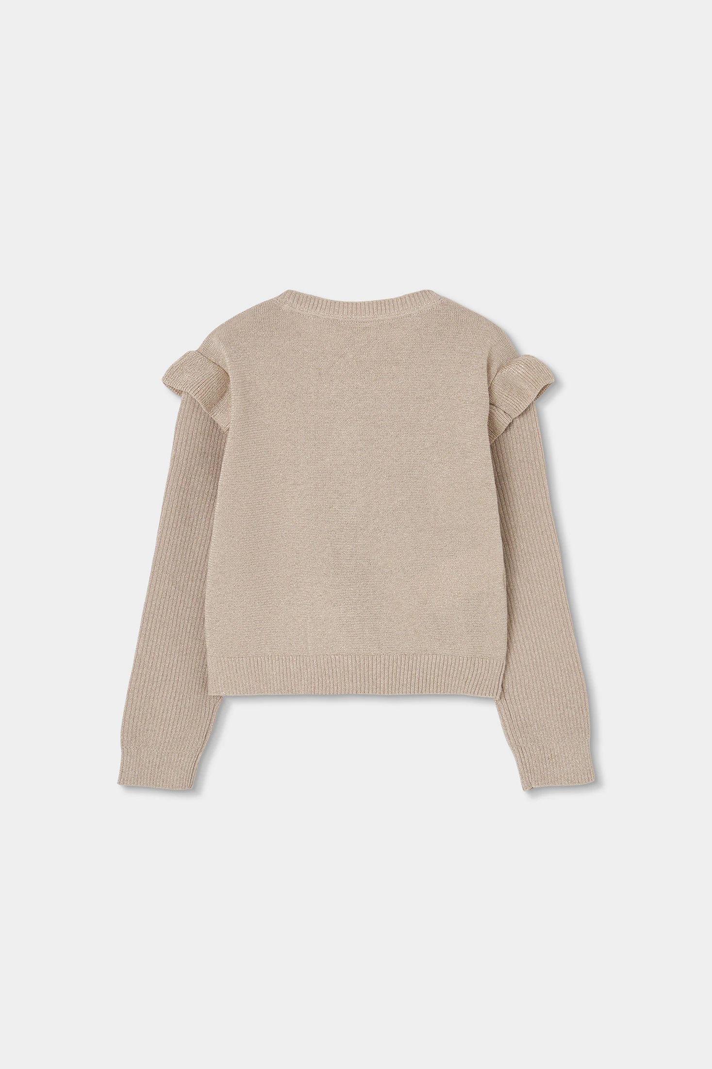 Chaqueta de punto para niña ideal para las estaciones de otoño e invierno. Confeccionada en un tejido suave, ofrece comodidad y calidez. El diseño en color beige la hace versátil y fácil de combinar con otras prendas. Presenta un cuello redondo y botones en la parte delantera, lo que facilita su uso. Los detalles de volantes en los hombros le añaden un toque de elegancia. Está disponible en tallas desde 2 hasta 14 años. Es perfecta para añadir un toque chic a cualquier conjunto cotidiano.