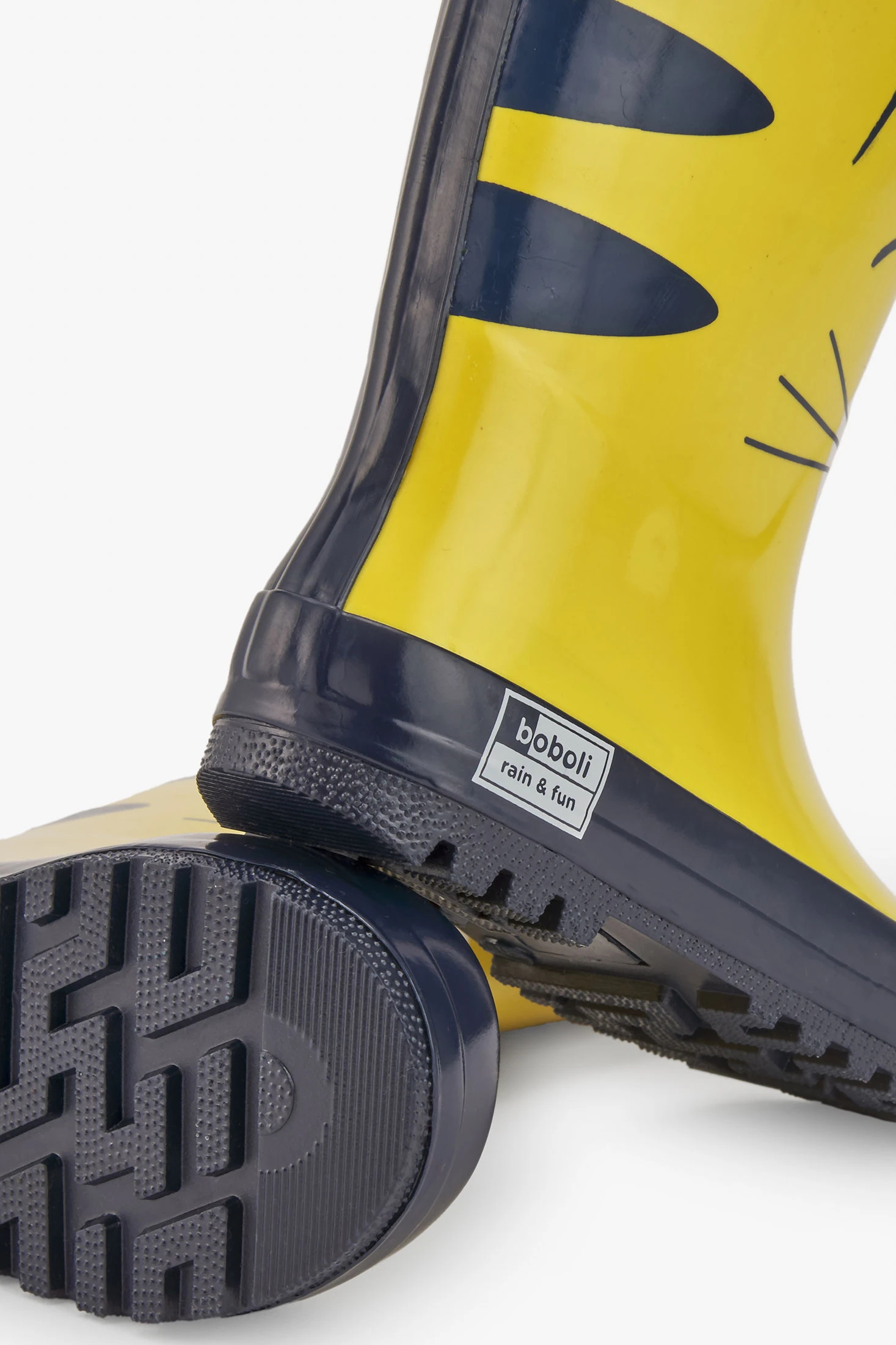 Bota de agua en color amarillo con un diseño de caritas de animales, perfectas para añadir un toque alegre al atuendo de los más pequeños. Fabricadas en materiales de alta calidad que aseguran comodidad y durabilidad, resultan ideales para proteger y mantener los pies secos en cualquier época del año. Disponibles en tallas desde 22/23 hasta 36/37, cuentan con suelas antideslizantes que garantizan seguridad durante los primeros pasos. Fáciles de combinar con distintos conjuntos, ofrecen tanto estilo como practicidad para cualquier ocasión.