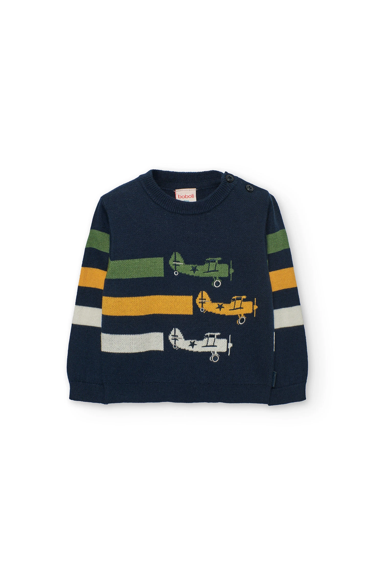 Jersey de punto para niño en azul marino con estampado de aviones, adecuado para las estaciones de otoño e invierno. Confeccionado en tejido de punto, ofrece calidez y confort, asegurando que tu pequeño se mantenga abrigado. Diseñado con cuello redondo y botones en el hombro, facilita el vestir diario. Disponible en tallas de 12 meses a 10 años, resulta versátil y combina fácilmente con pantalones casuales. El elegante color azul marino proporciona un estilo clásico que complementa cualquier guardarropa infantil.