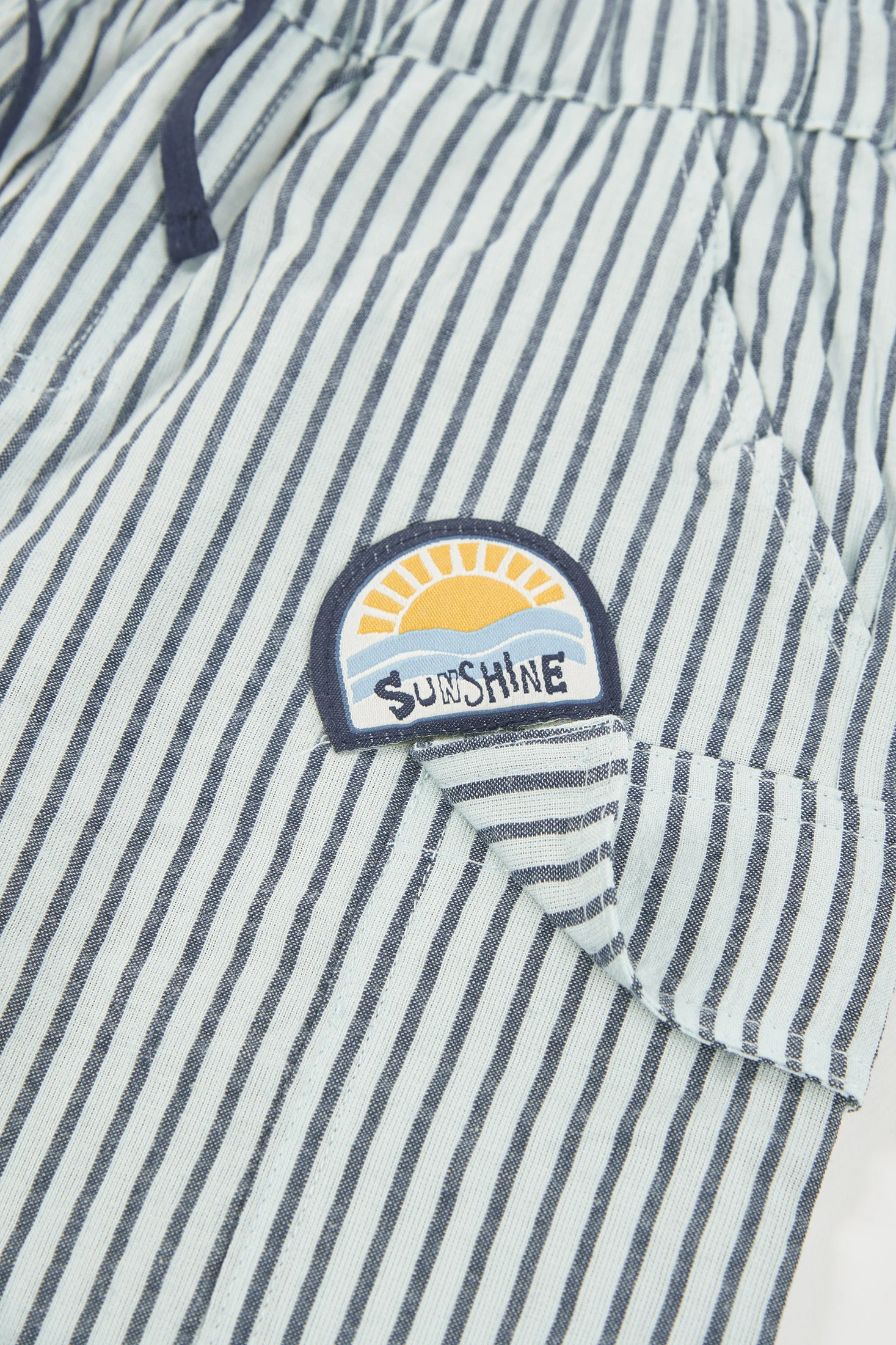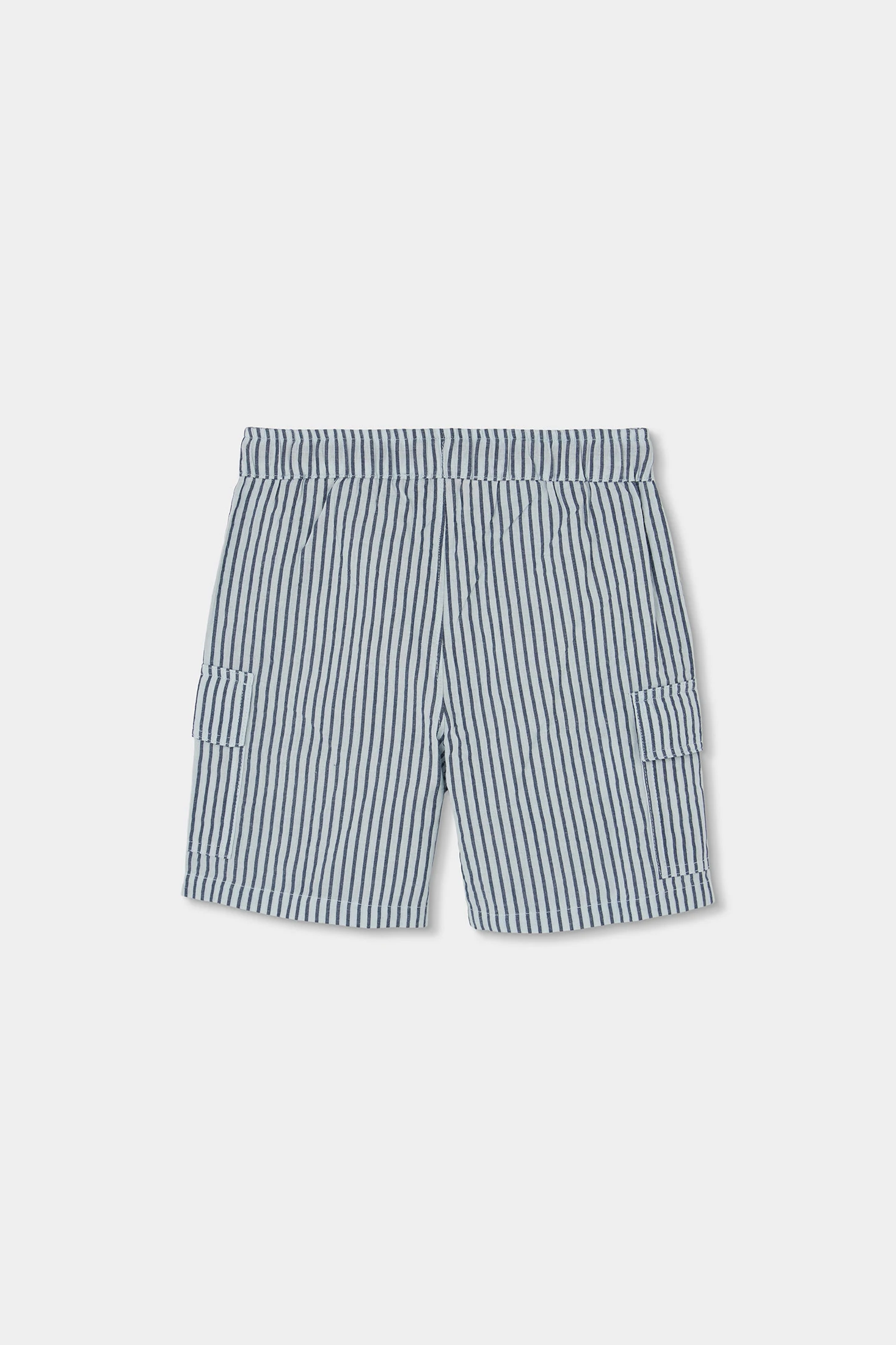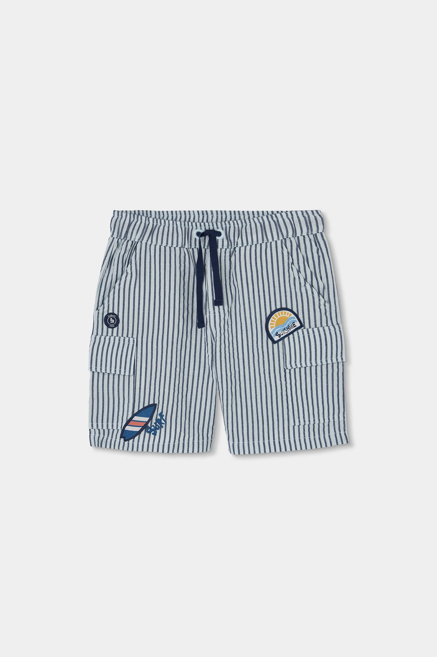 Bermudas de popelín listadas para niño, ideales para el verano, fabricadas en un tejido fresco y ligero. Presentan un diseño de rayas azules y blancas con parches decorativos. La cintura elástica con cordón ajustable garantiza un ajuste cómodo. Con bolsillos laterales para mayor funcionalidad, son perfectas para un estilo casual y relajado. Disponibles en tallas de 12 meses hasta 10 años, ofrecen versatilidad para diferentes edades. Una opción estilosa para un look veraniego.