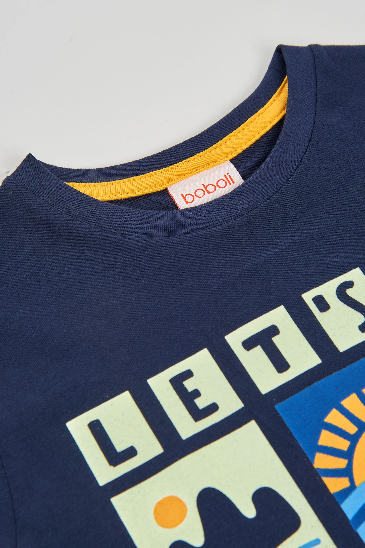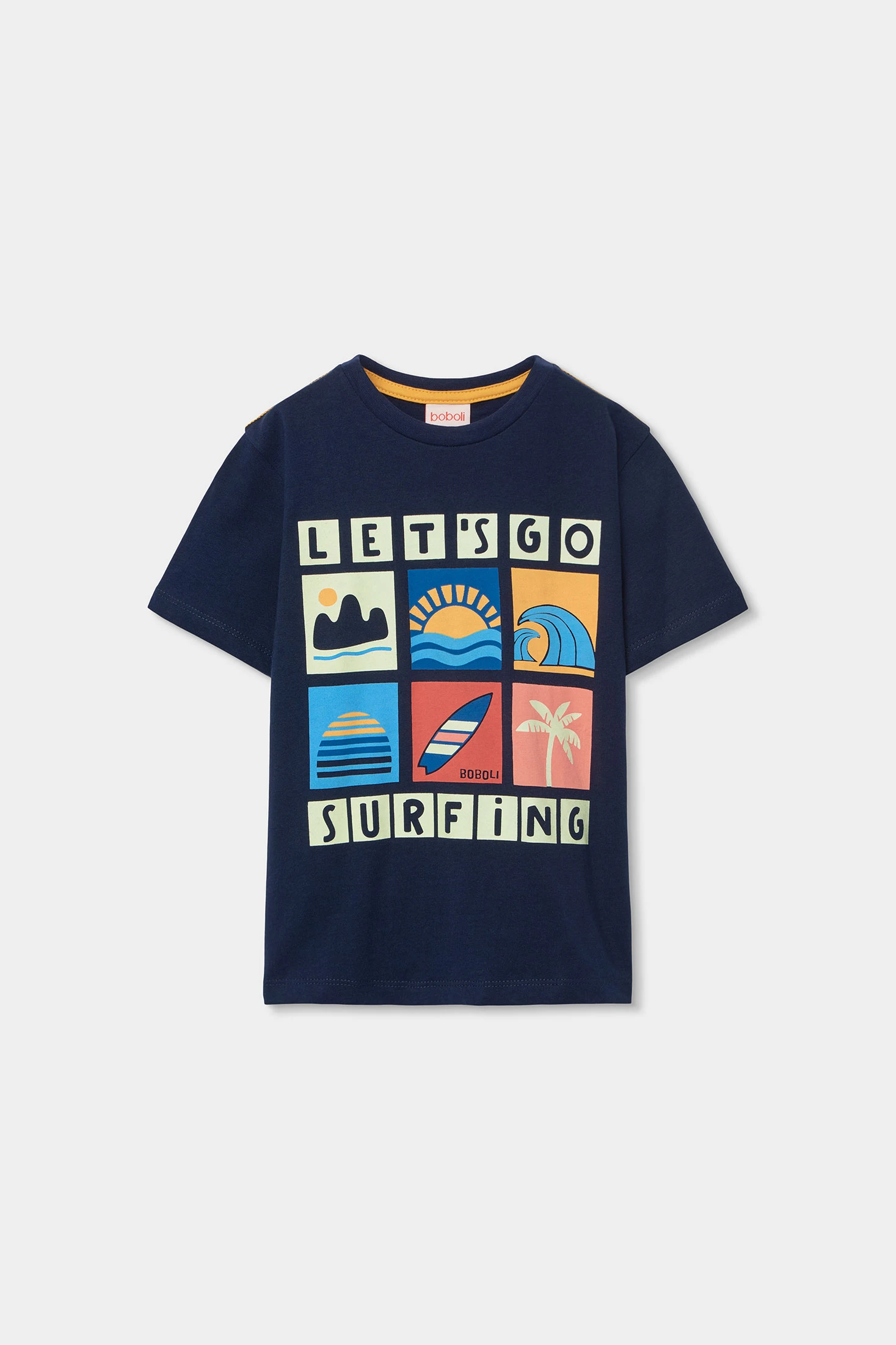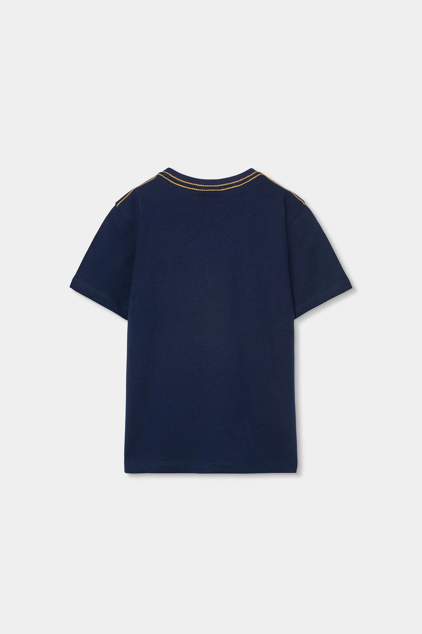 Camiseta de punto azul marino para niño, perfecta para el día a día. Diseñada con ilustraciones gráficas coloridas le añade un toque divertido y moderno. El material de punto asegura comodidad y flexibilidad, ideal para niños activos. Cuenta con un cuello redondo y mangas cortas. Disponible en tallas desde 12 meses hasta 10 años, es una opción versátil que combina fácilmente con pantalones o shorts informales.