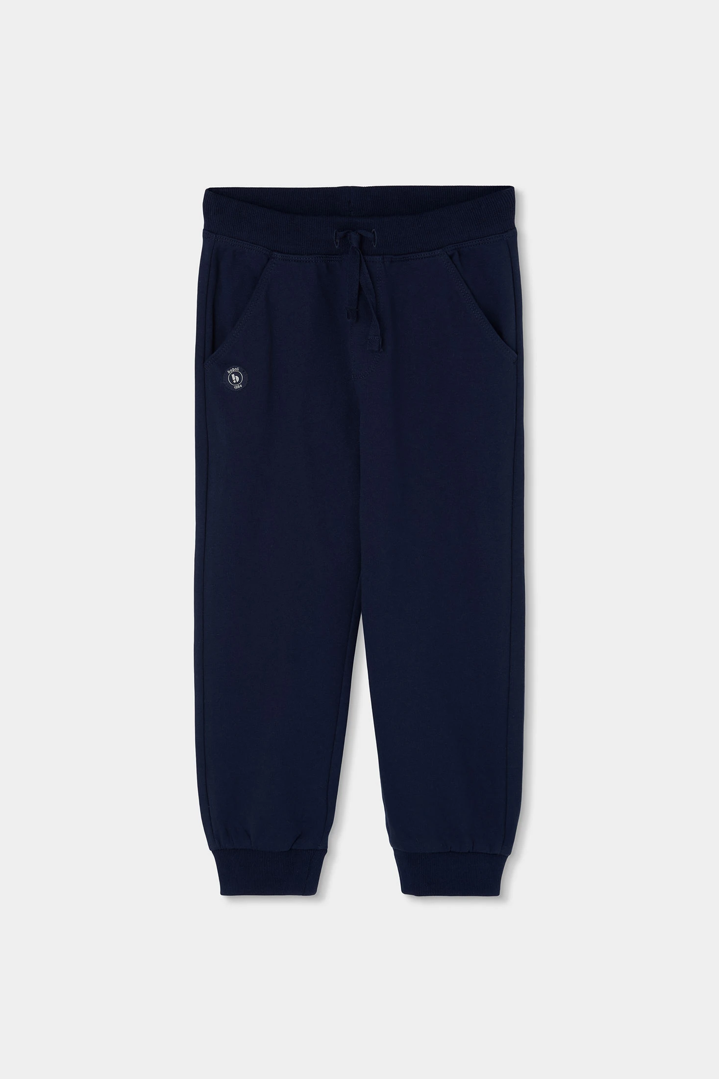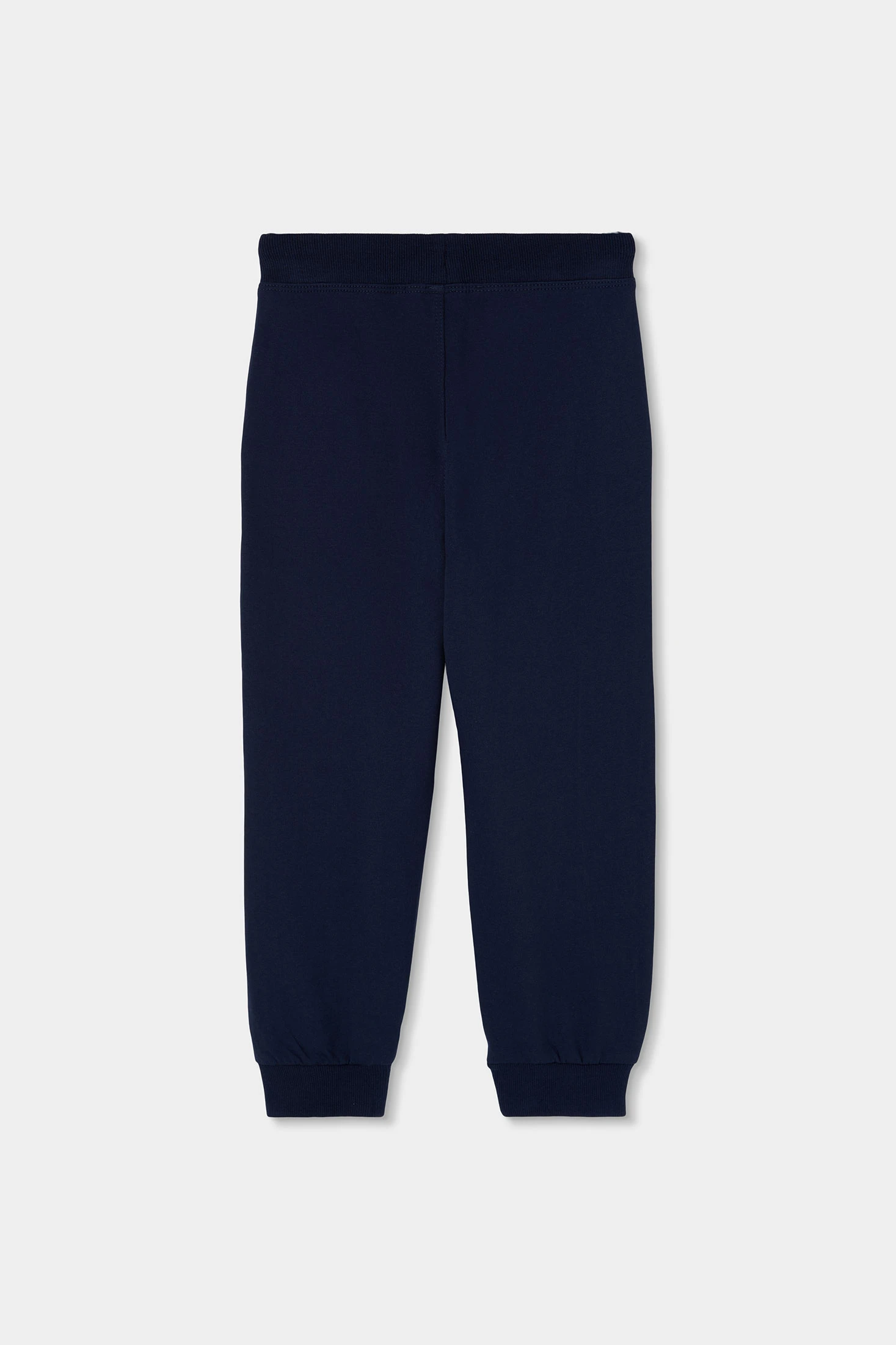 Conjunto de sudadera y pantalón azul marino. La sudadera tiene rayas en tonos azul y blanco con un estampado veraniego de sol y olas que añade un toque divertido. El pantalón es azul oscuro con una cintura elástica con cordón ajustable. Hecho de material de punto cómodo y cálido, es ideal para el uso diario. Disponible en tallas desde 12 meses hasta 10 años, combina estilo y confort. Perfecto para crear un look casual y moderno.