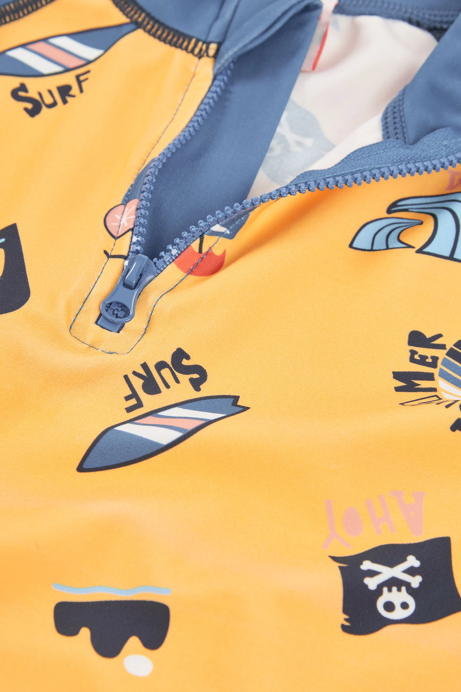 Camiseta poliamida stampada. Hecha de material ligero y transpirable, ofrece comodidad y flexibilidad. El diseño presenta dibujos divertidos, como surf y olas, en un vibrante color amarillo con mangas azules. El cierre de cremallera en el cuello facilita su ajuste. Disponible en tallas desde 6 meses hasta 14 años, es perfecta para proteger del sol durante el verano. Una elección estilosa y funcional para los pequeños aventureros. Prenda con protección solar UPF50