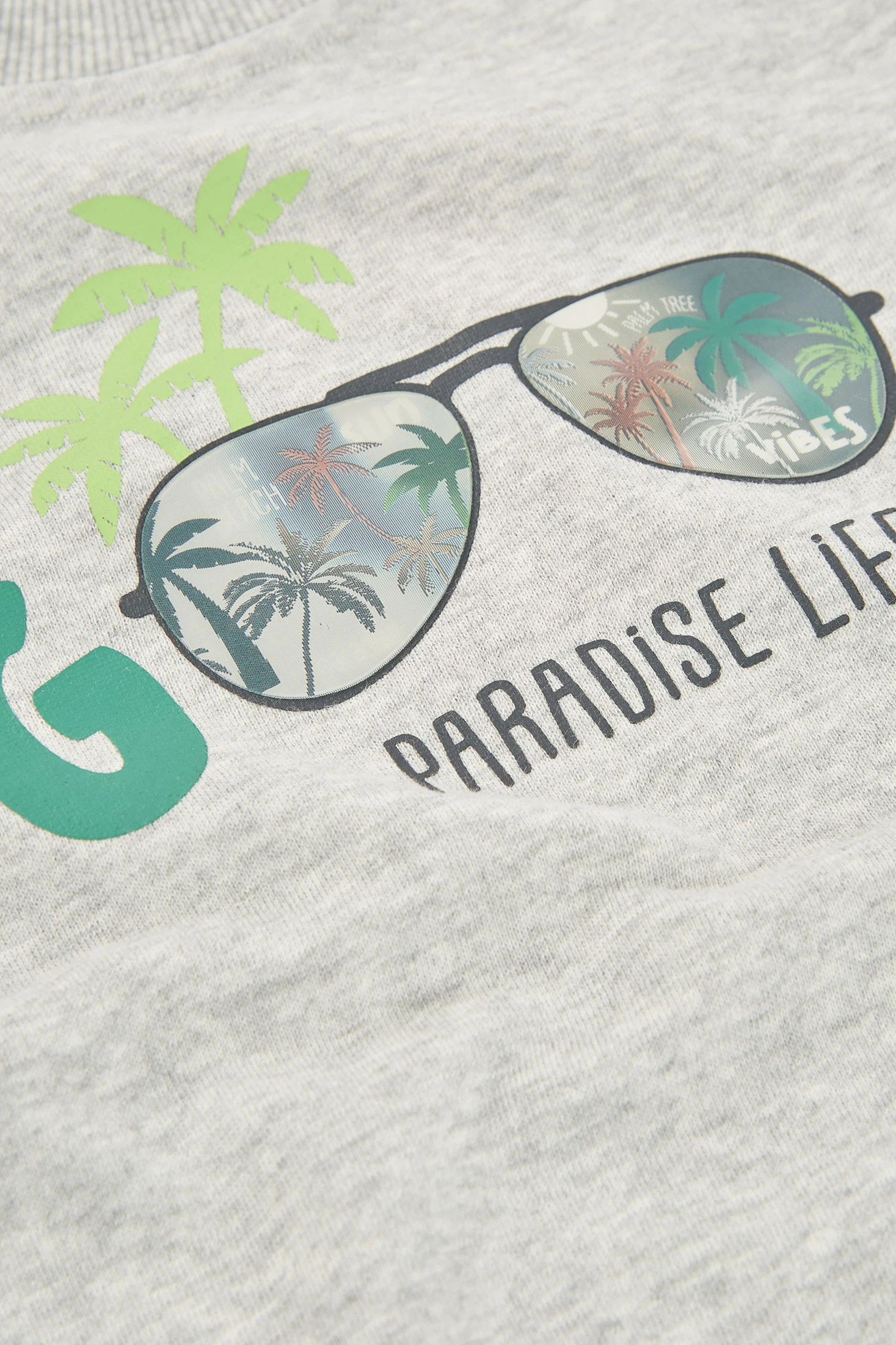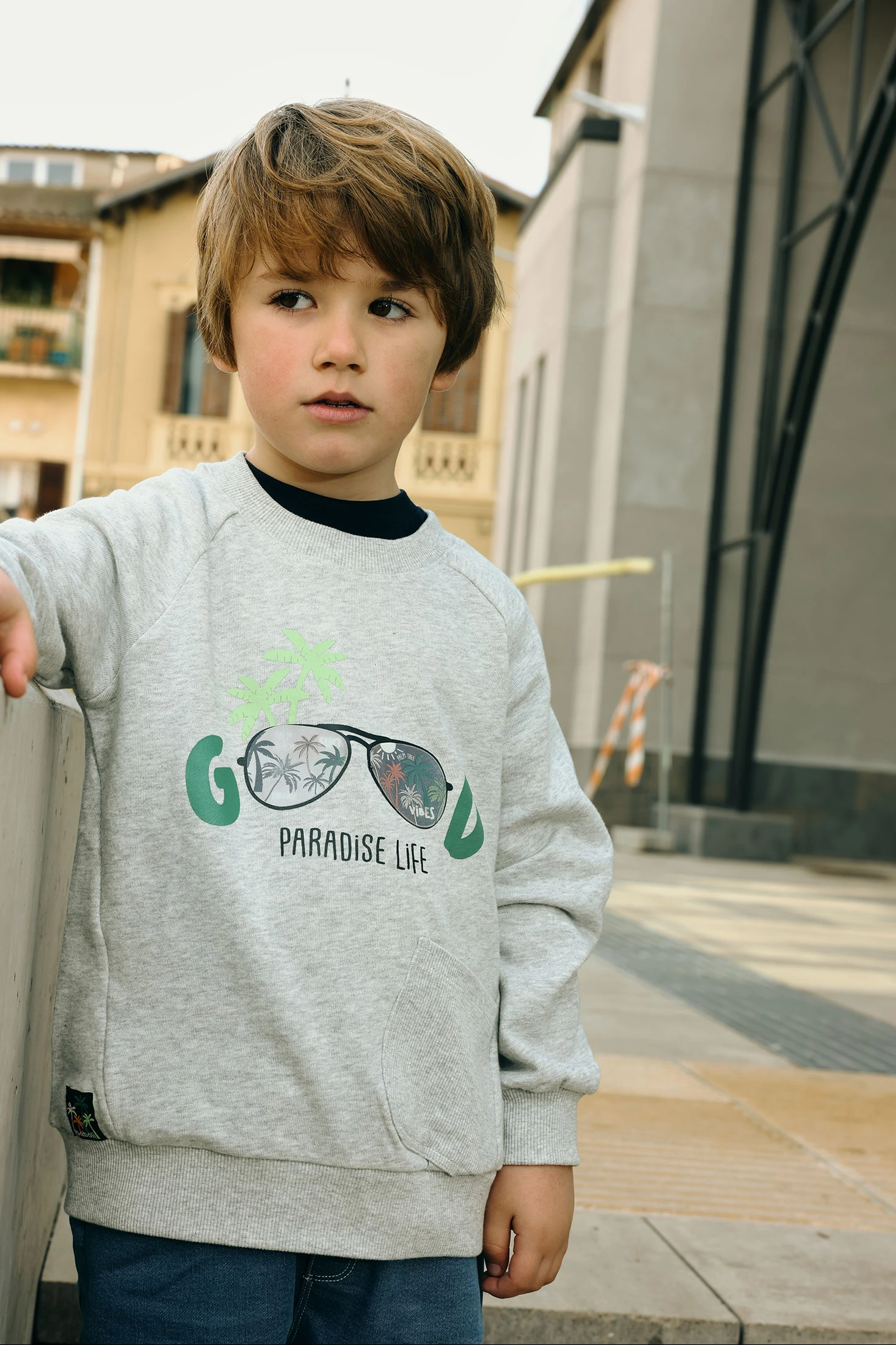 Sudadera de felpa para niño. De un suave color crudo vigoré, presenta un estampado frontal con texto y palmeras, ofreciendo un estilo moderno y divertido. Su tejido de felpa garantiza comodidad y calidez. Ideal para edades desde 12 meses hasta 10 años. Con cuello redondo y mangas largas, es una prenda versátil que puede combinarse fácilmente con jeans o pantalones de chándal, adecuada para el uso diario y actividades al aire libre.