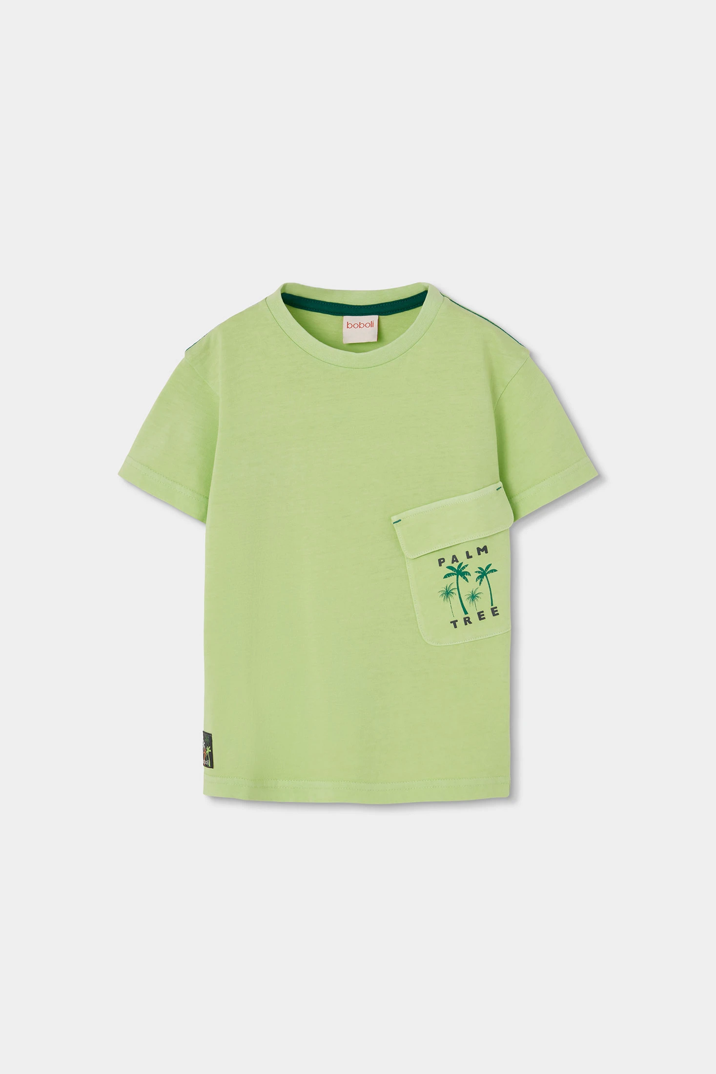 Camiseta de algodón para niño, ideal para las estaciones cálidas. De color verde claro, cuenta con un diseño sencillo y un bolsillo decorativo con palmeras y la inscripción "Palm Tree". Su tejido de algodón garantiza frescura y comodidad, perfecto para el uso diario. Disponible en tallas desde 12 meses hasta 10 años, ofrece flexibilidad para adaptarse al crecimiento de tu pequeño. El corte clásico y el cuello redondo la hacen fácil de combinar con distintos estilos de ropa, agregando un toque divertido a su atuendo diario.