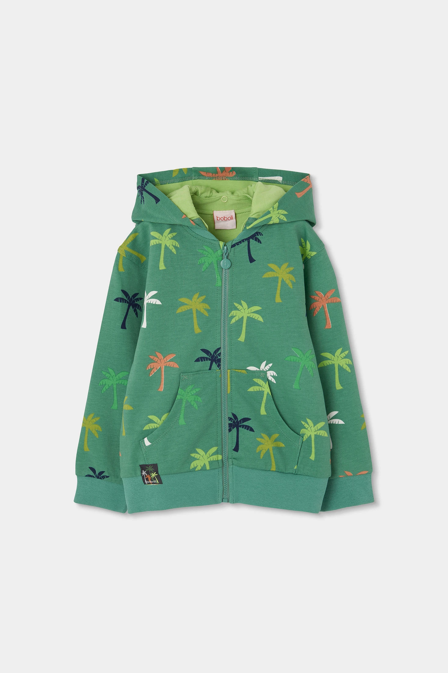 Chaqueta de felpa para niño. De color verde, presenta un divertido estampado de palmeras en varios tonos. Su diseño incluye capucha desmontable y cierre con cremallera para mayor practicidad. Confeccionada en un material suave, es cómoda y cálida. Disponible en tallas desde 12 meses hasta 10 años, es perfecta para combinar con jeans o pantalones casuales, ofreciendo estilo y confort en cada uso.