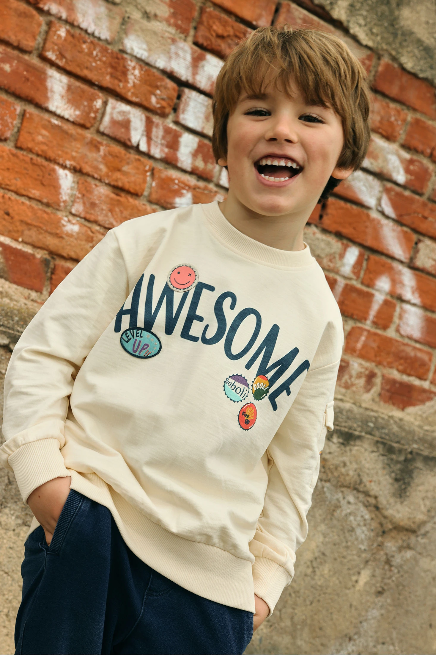 Sudadera para niños ideal para los dias más frescos deverano y primavera. Confeccionada en suave tejido de punto, ofrece comodidad y calidez. De color beige claro, presenta un estampado divertido con la palabra "AWESOME" y pequeños gráficos coloridos. Ideal para edades de 1 a 10 años. Su cuello redondo y mangas largas la hacen perfecta para combinar con jeans o pantalones casuales, añadiendo un toque de estilo moderno y alegre.