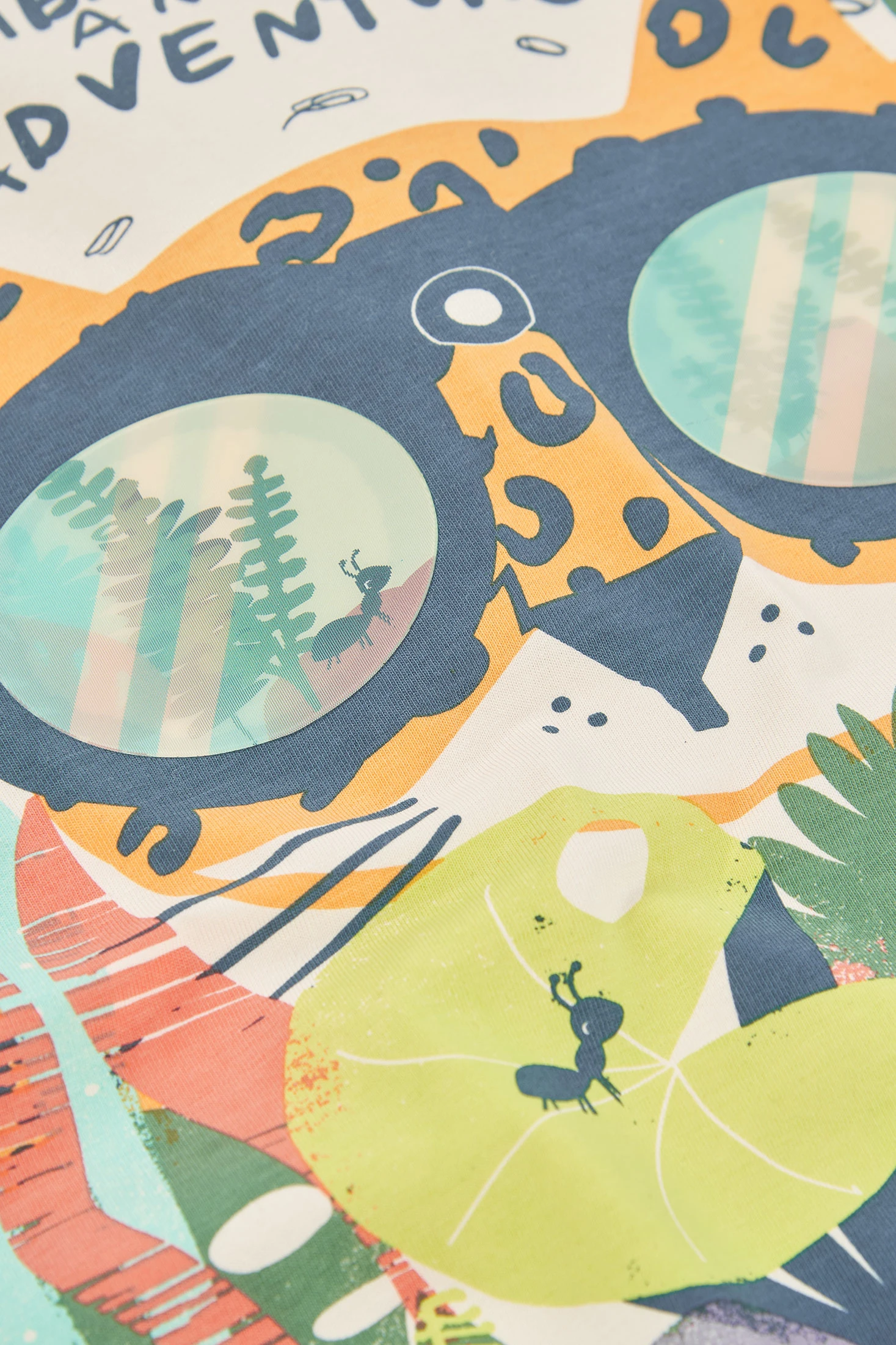 Camiseta de algodón crudo para niño, ideal para el verano, presenta un diseño alegre con un gran dibujo frontal de un leopardo con gafas y una frase inspiradora. Su tejido de algodón proporciona comodidad y transpirabilidad, perfecto para el uso diario. Disponible en tallas desde 12 meses hasta 10 años, se adapta al crecimiento de tu pequeño. Su color neutro permite combinarla fácilmente con pantalones cortos o jeans, haciendo de esta camiseta una opción versátil y divertida para las aventuras diarias.