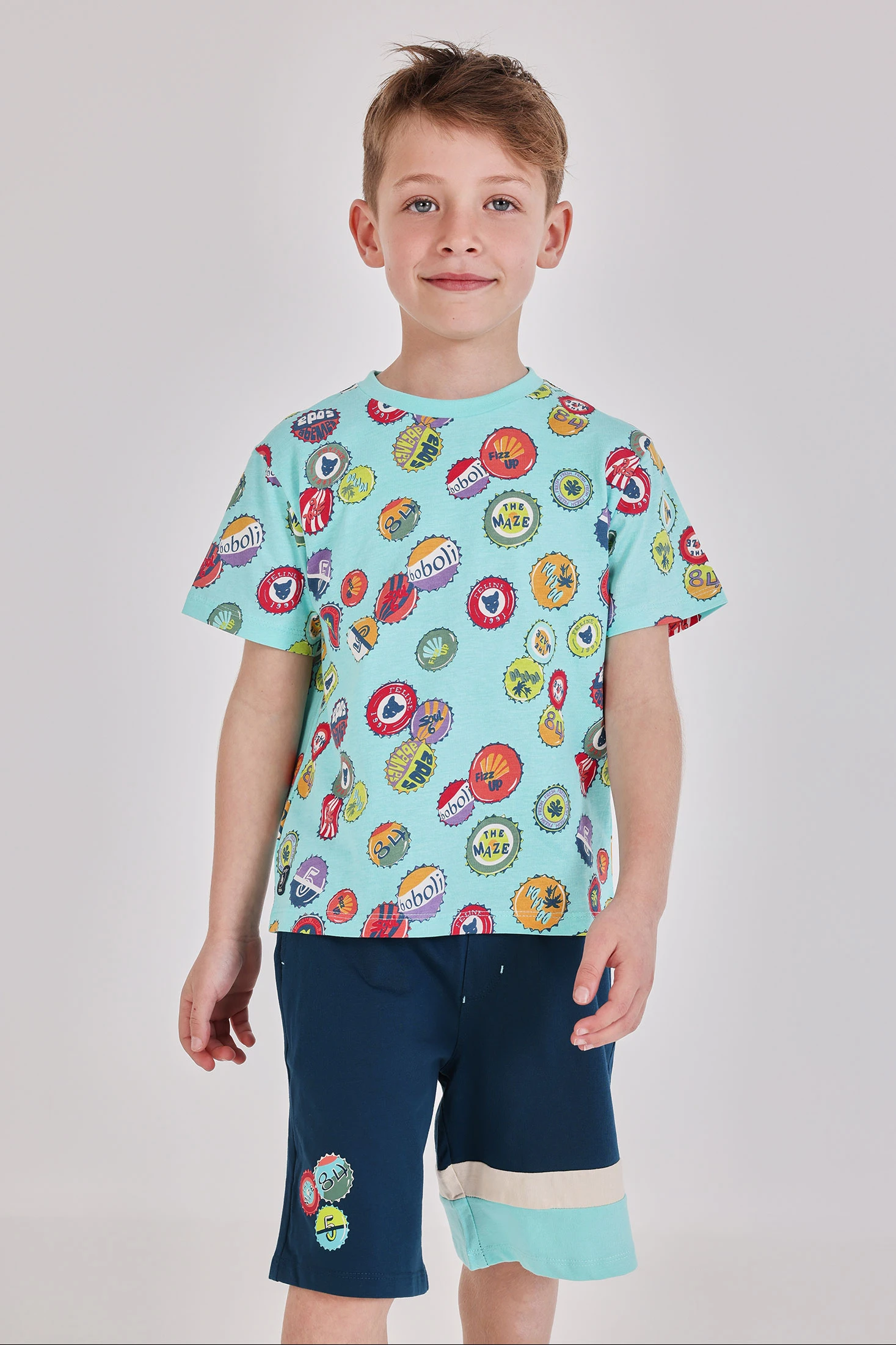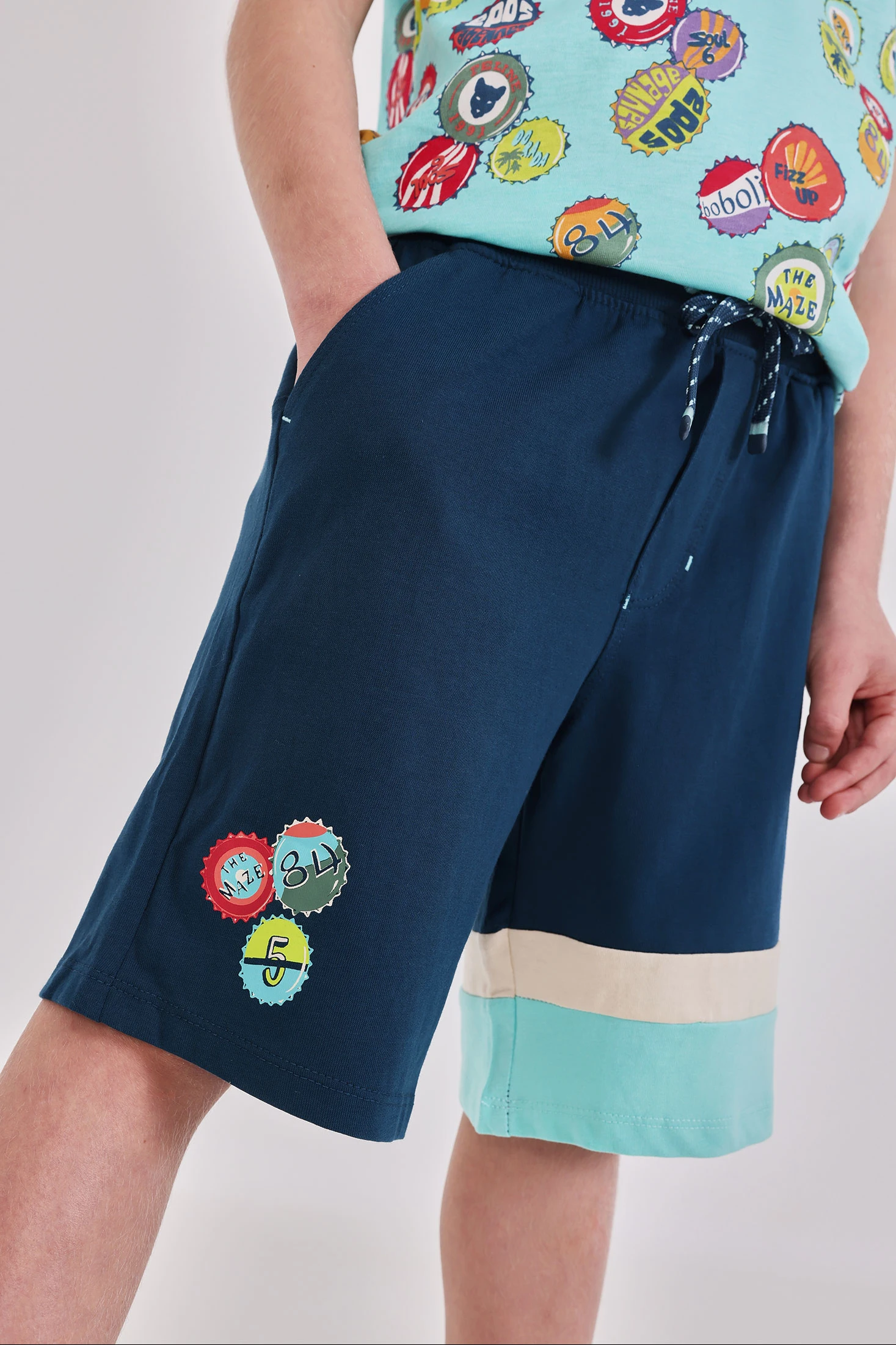 Bermudas de punto verde oscuro para niño, perfectas para la temporada de primavera y verano. Confeccionadas en tejido suave que proporciona comodidad y frescura, presentan un diseño con estampados divertidos de chapas en la parte inferior. La cintura ajustable con cordón asegura un ajuste cómodo. Las tallas disponibles van desde 12 meses hasta 14 años, adaptándose al crecimiento del niño. Ideales para combinar con camisetas casuales, ofrecen un estilo relajado para actividades diarias. Las franjas en tonos beige y azul claro aportan un toque de color adicional.