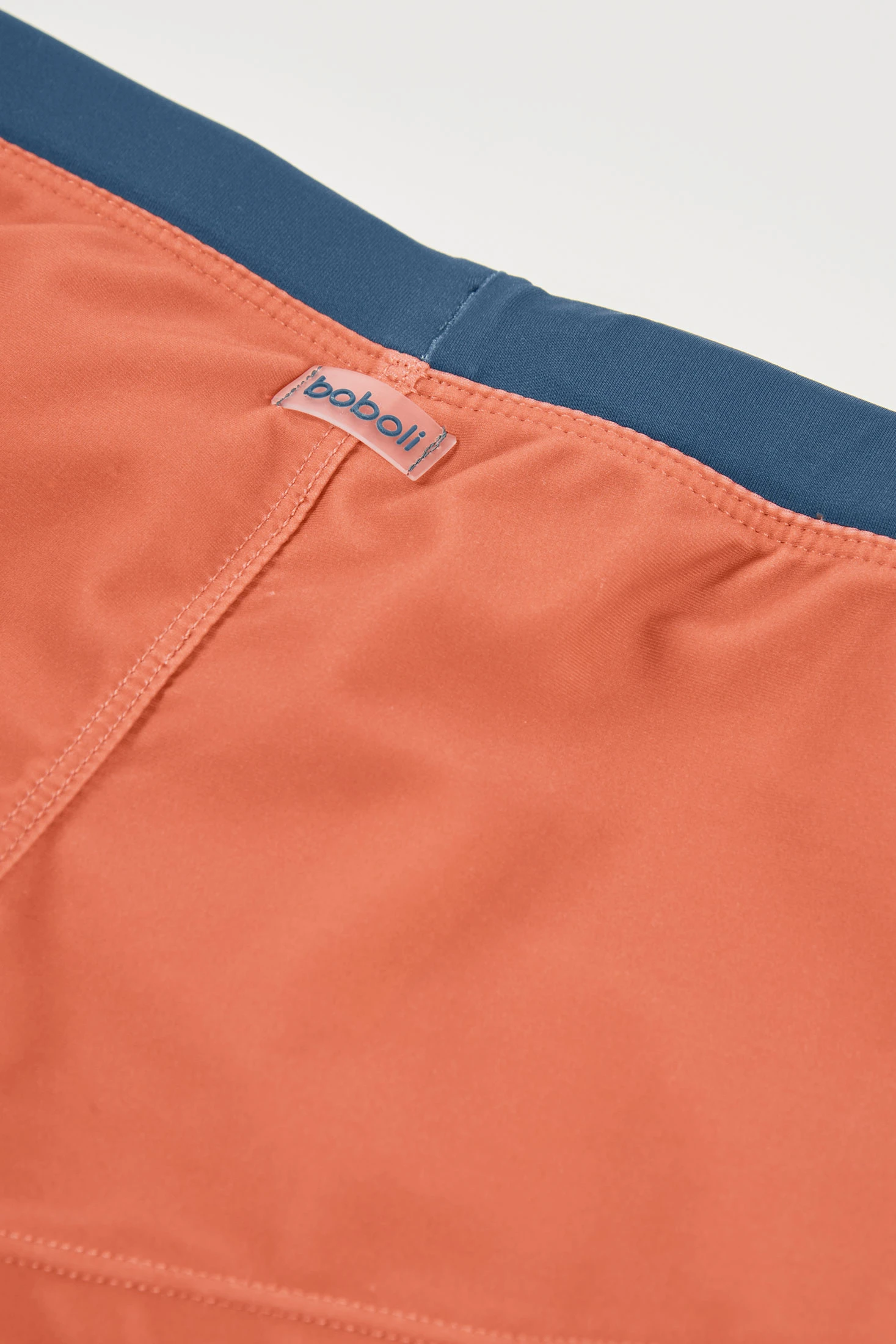 Bañador para niño en color naranja, perfecto para disfrutar del verano. Hecho de material elástico y cómodo, cuenta con un diseño divertido que incluye gráficos y texto. La cintura es ajustable mediante un cordón azul para un mejor ajuste. Disponible en tallas desde 12 meses hasta 10 años, asegurando comodidad en todas las edades. Ideal para el uso en la playa o la piscina, añade un toque de estilo y diversión a las actividades acuáticas de cualquier pequeño. Prenda con protección solar UPF50