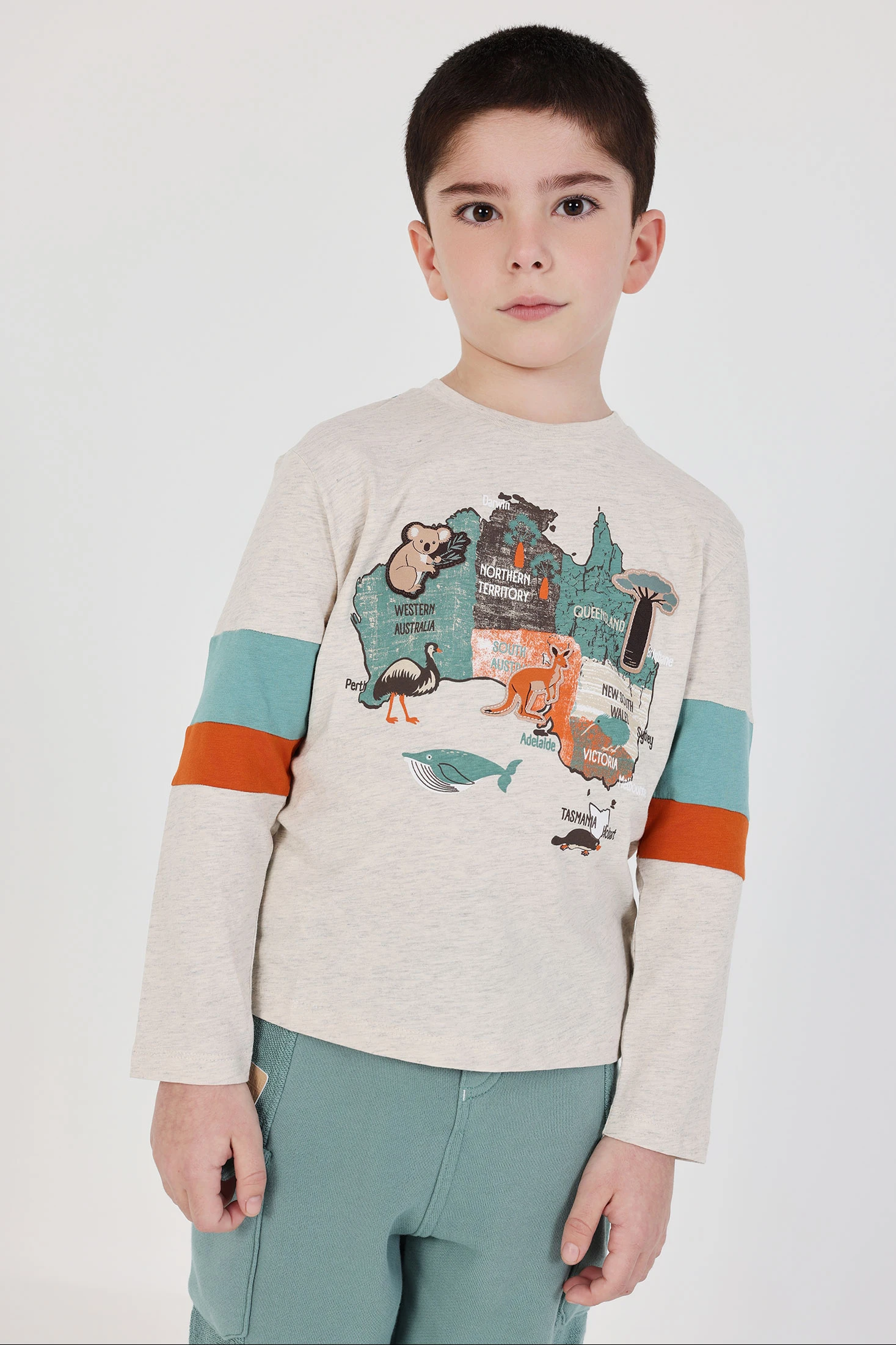 Camiseta de punto manga larga para niño confeccionada en algodón beige, perfecta para los dias más frescos de verano y primavera. Presenta un estampado colorido con dibujos de animales. Confeccionada en un tejido suave, garantiza comodidad y flexibilidad para el uso diario. Disponible en tallas desde 12M hasta los 10 años. Su diseño es versátil, ideal para combinar con jeans o pantalones casuales, añadiendo un toque divertido a cualquier atuendo.