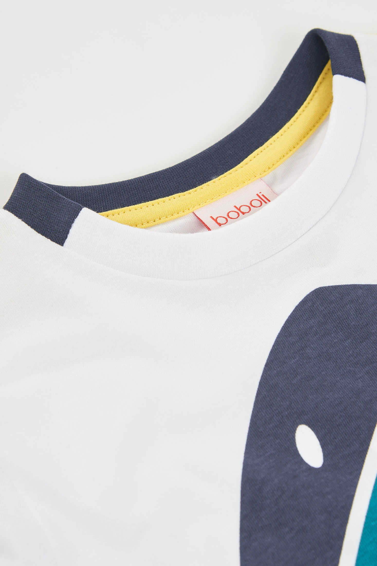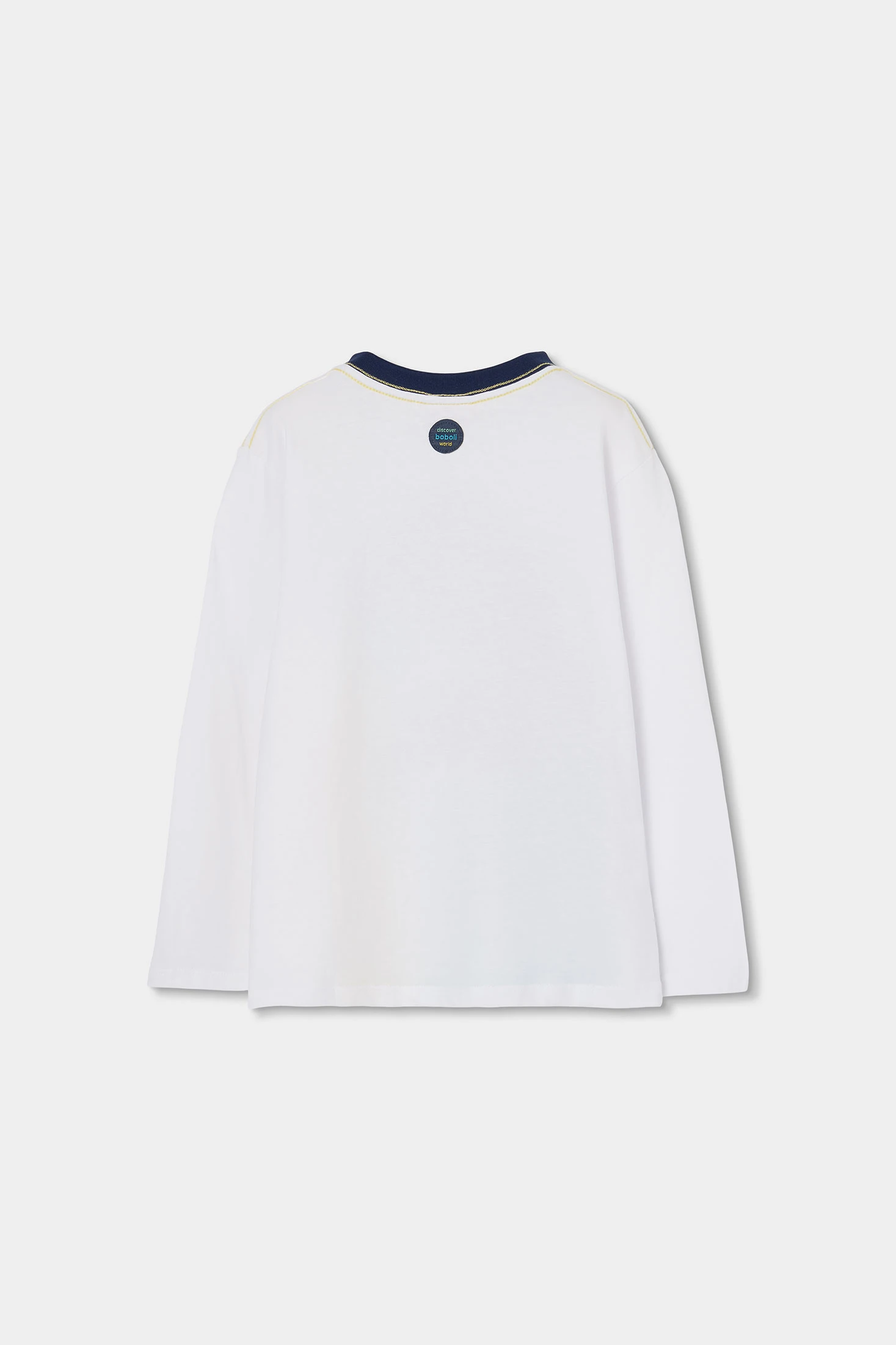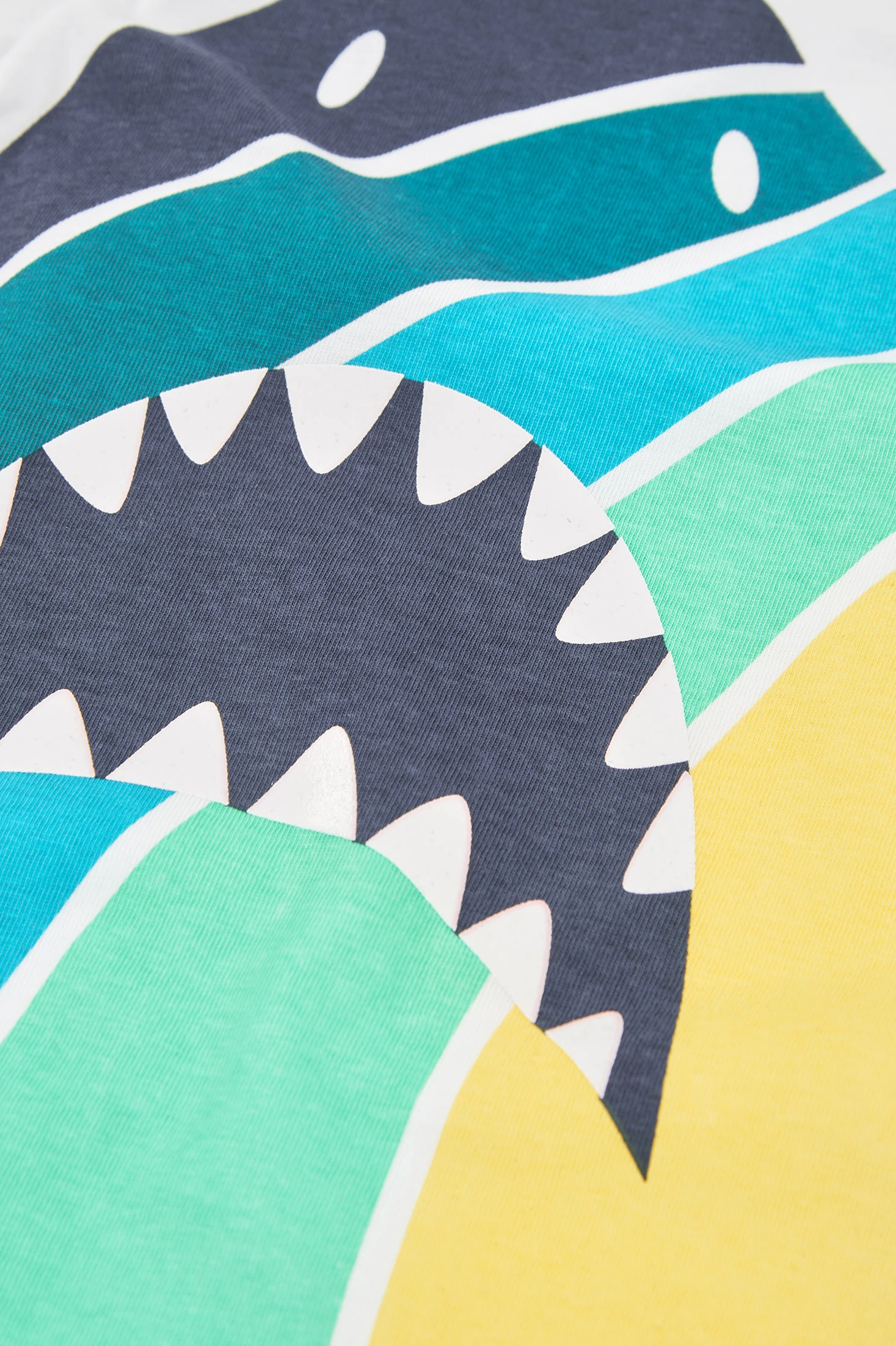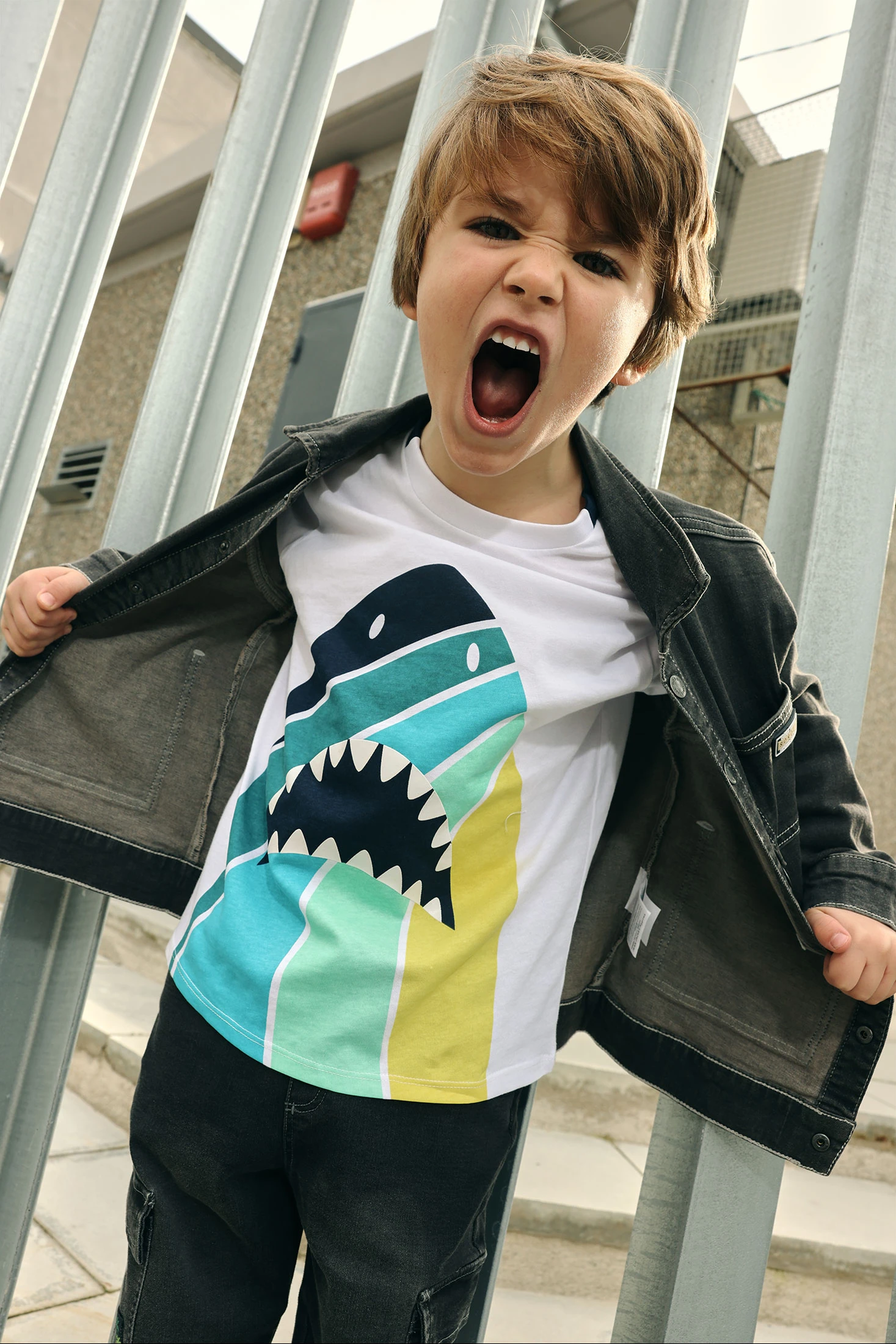 Camiseta de algodón de manga larga para niño, perfecta para entretiempo. Su tejido de punto ofrece comodidad y calidez. De color blanco, cuenta con un divertido diseño de un tiburón en colores vibrantes como azul, verde y amarillo. Diseñada para niños de 12 meses hasta 10 años, se adapta a múltiples etapas de crecimiento. Ideal para combinar con jeans o pantalones casuales, es una opción versátil para el día a día.