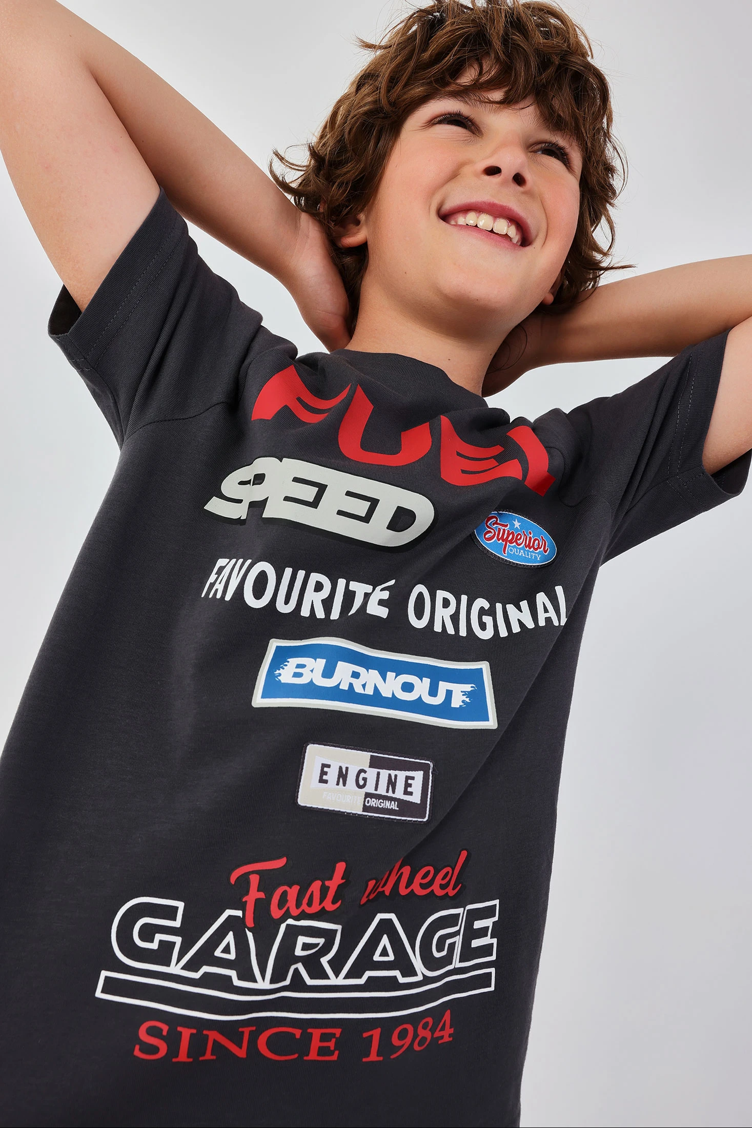 Camiseta de algodón gris para niño, perfecta para el día a día. Su diseño presenta varias palabras y gráficos relacionados con coches y velocidad, dándole un toque moderno y divertido. Confeccionada en material suave y cómodo, ideal para mantener a los pequeños activos. Disponible en tallas desde 2 años hasta 14 años, se adapta bien a cualquier etapa de crecimiento. Su estilo casual la hace fácil de combinar con jeans o shorts, siendo una opción versátil para diversas ocasiones.