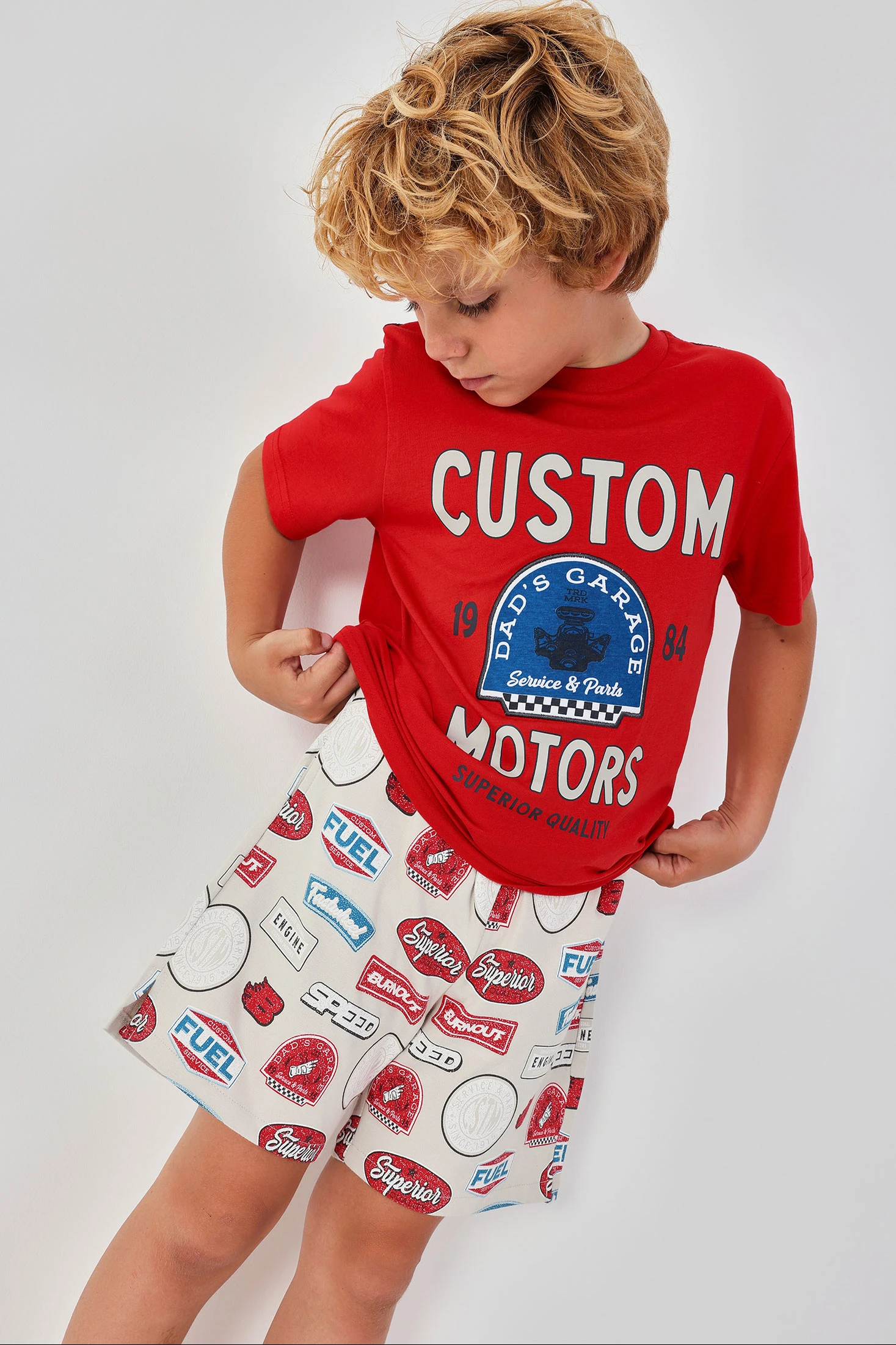 Bermuda de felpa estampada perfecta para niños, ideal para un look casual y cómodo. Con un diseño de parches coloridos en tonos rojo y azul que destacan sobre el fondo beige, aporta un toque divertido. Su material de felpa garantiza suavidad y comodidad para el día a día. Disponible en tallas desde 2 años hasta 14 años, se adapta al crecimiento de tu hijo. La cintura ajustable con cordón asegura un ajuste perfecto. Ideal para combinar con camisetas básicas para un estilo relajado y moderno.