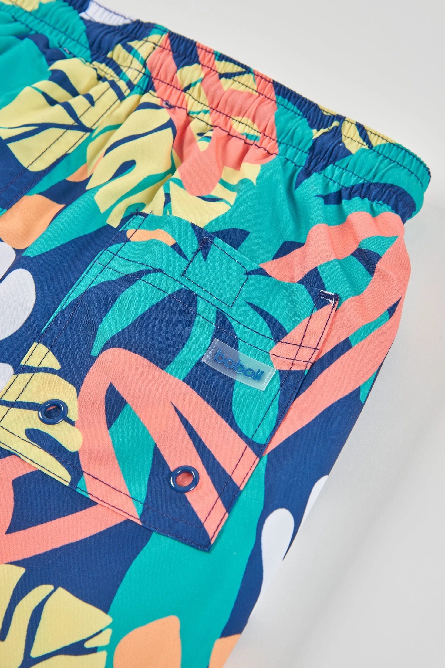 Bañador azul confeccionado con tejido reciclado, ideal para los días de playa. Presenta un diseño colorido con hojas y formas abstractas. El material es ligero y de secado rápido, garantizando comodidad y practicidad. Dirigido a edades desde 2 años hasta 14 años, asegura un ajuste adecuado durante el crecimiento. El cinturón elástico con cordón ajustable ofrece mayor seguridad. Una opción perfecta para disfrutar de la piscina o el mar con estilo y sostenibilidad.
