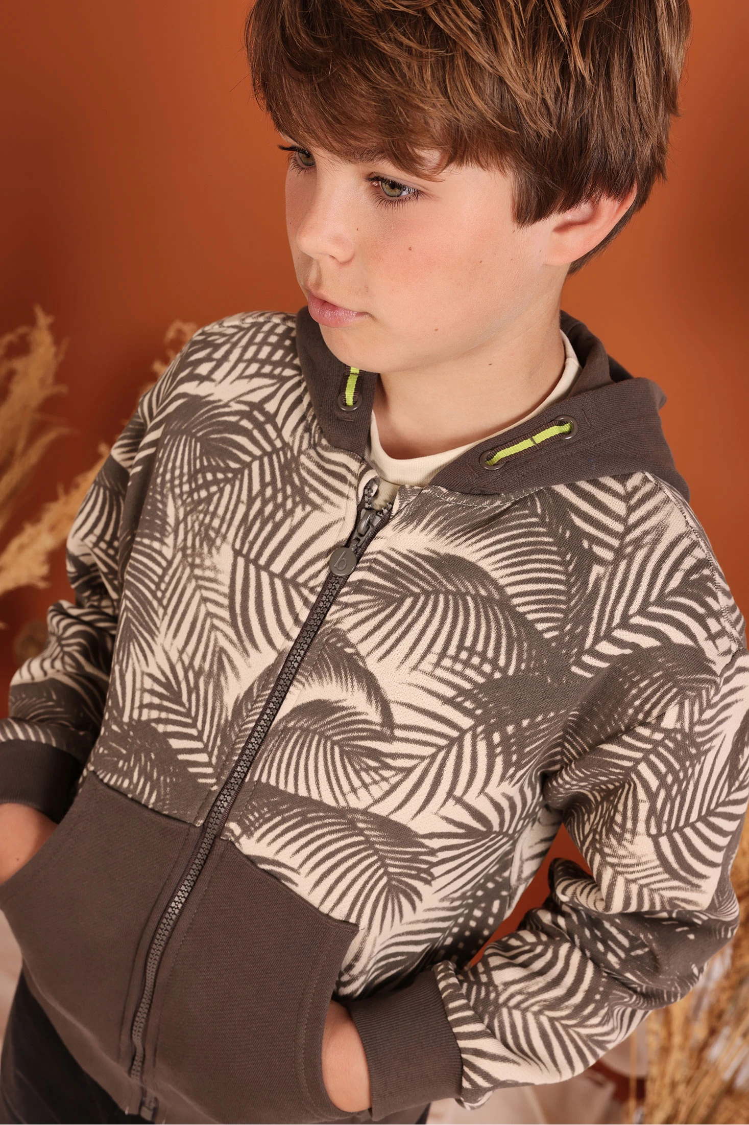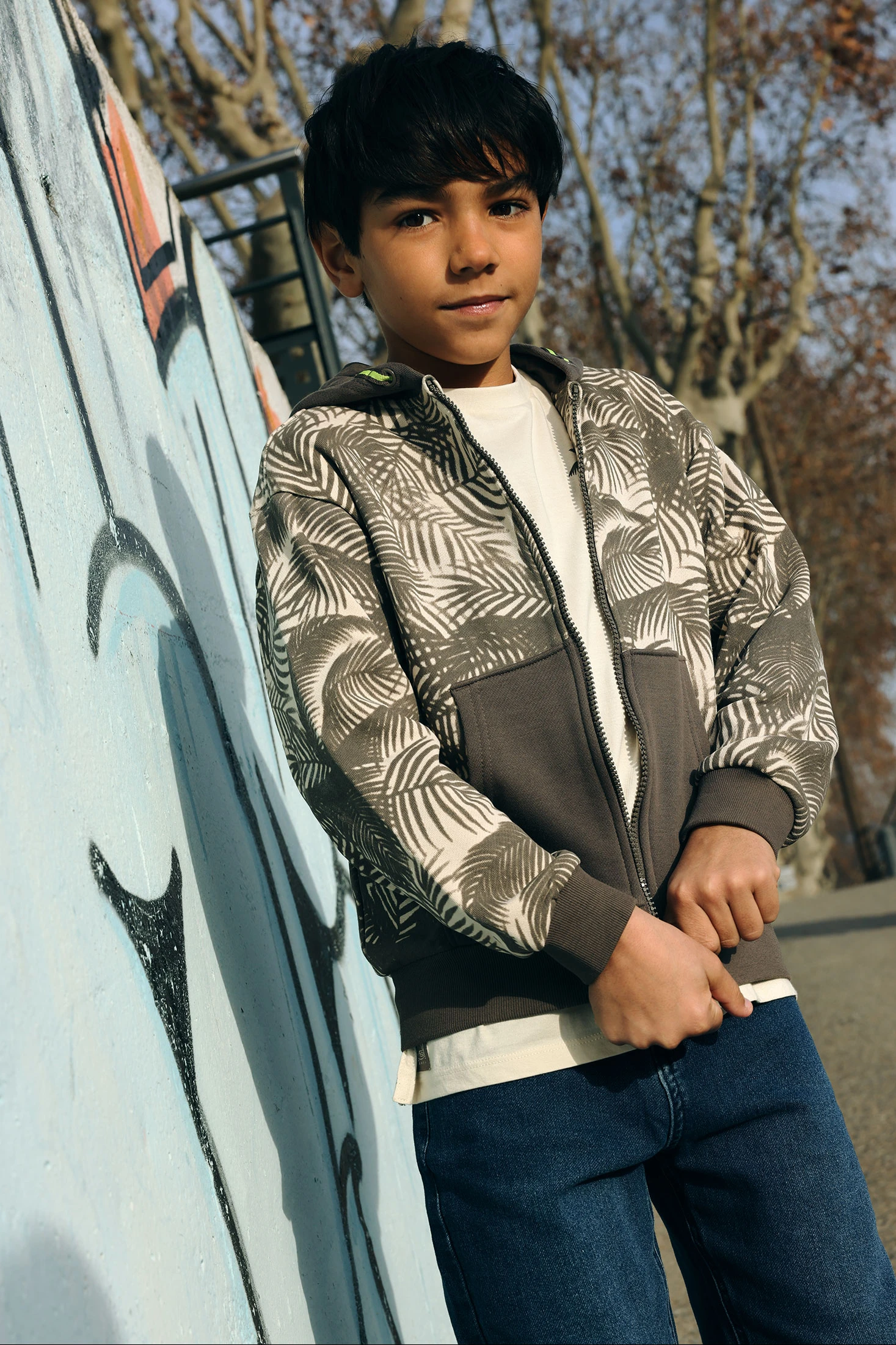 Chaqueta de felpa para niño, ideal para el otoño e invierno. Con un diseño estampado de hojas en tonos marrones sobre fondo beige, ofrece un estilo único y atractivo. El material de felpa suave proporciona calidez y comodidad, perfecto para los días de primavera. Viene equipada con una capucha práctica y un cierre de cremallera frontal. Disponible en tallas desde 2 años hasta 14 años, es versátil y funcional. Su estilo desenfadado permite combinarla fácilmente con jeans o pantalones casuales para un look moderno y confortable.
