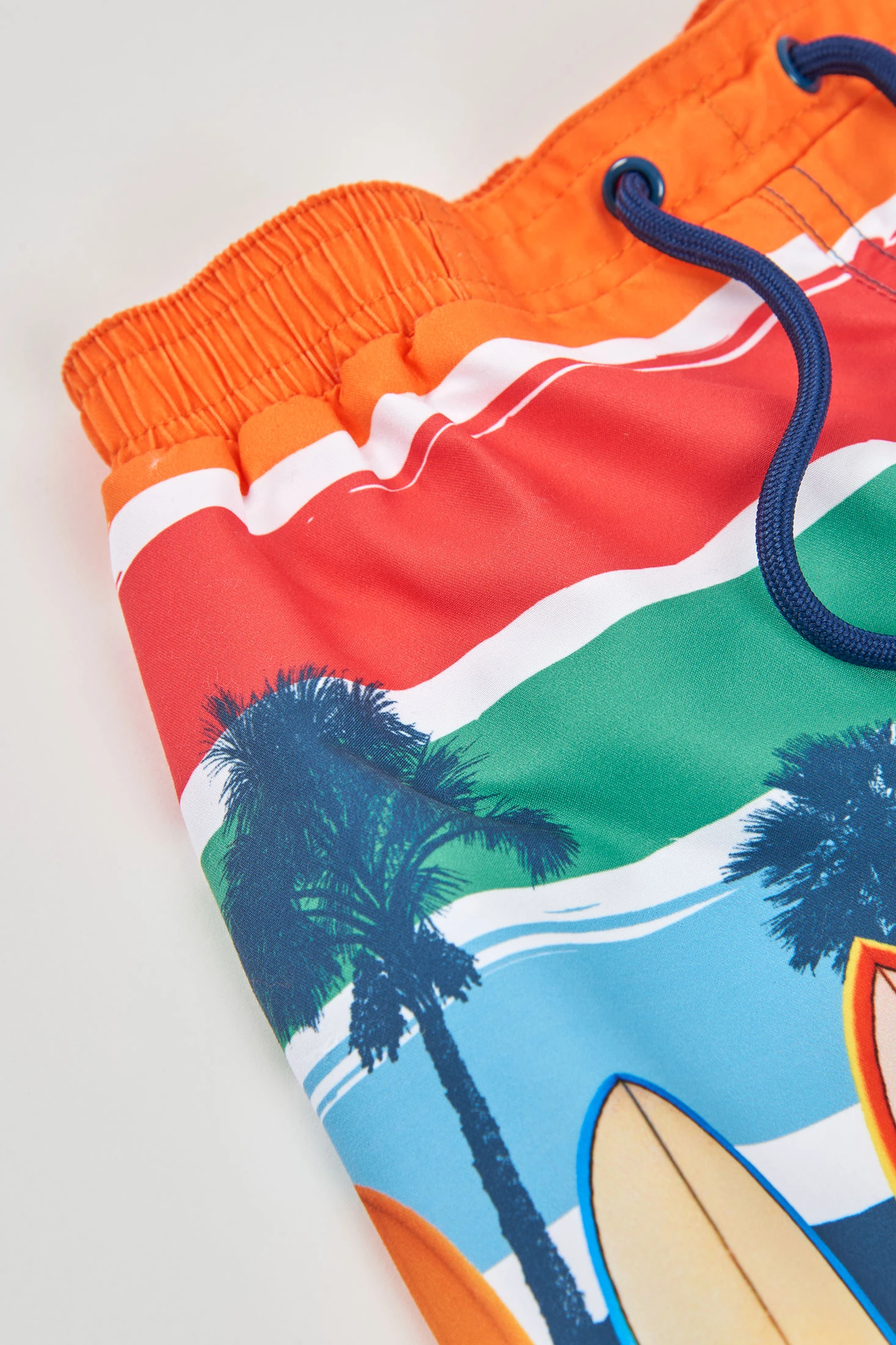 Bañador tejido reciclado naranja, perfecto para pequeños aventureros del agua. Disponible en tallas desde 2 años hasta los 14 años, adaptándose al crecimiento. Diseñado con tablas de surf y palmeras sobre rayas multicolores, añade un toque tropical y divertido. Material reciclado ligero y cómodo, ideal para el verano. Incluye una cintura elástica con cordón ajustable para mayor seguridad y adaptabilidad. Una opción sostenible y estilosa para disfrutar de los días de playa o piscina.