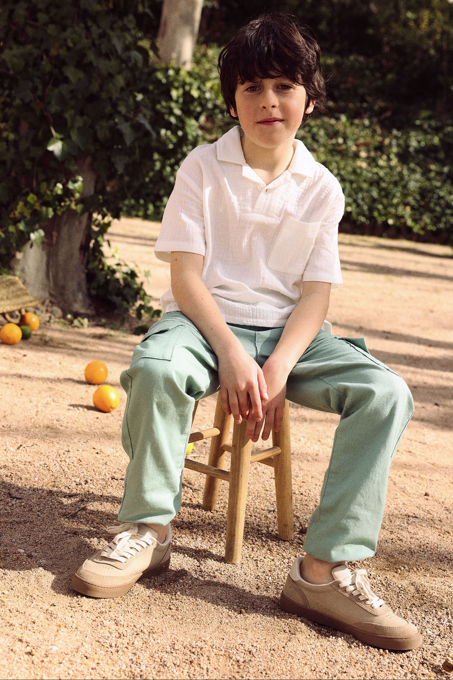 Pantalón de lino verde para niño, ideal para ocasiones casuales. Su tejido ligero y transpirable lo hace perfecto para la primavera y el verano. El diseño incluye bolsillos laterales y un cierre frontal, combinando estilo y funcionalidad. Disponible en tallas desde 12 meses hasta 10 años, garantiza un ajuste cómodo a lo largo del crecimiento. Su color azul marino lo convierte en una prenda versátil y fácilmente combinable con camisas o polos de colores claros para un look elegante y fresco.