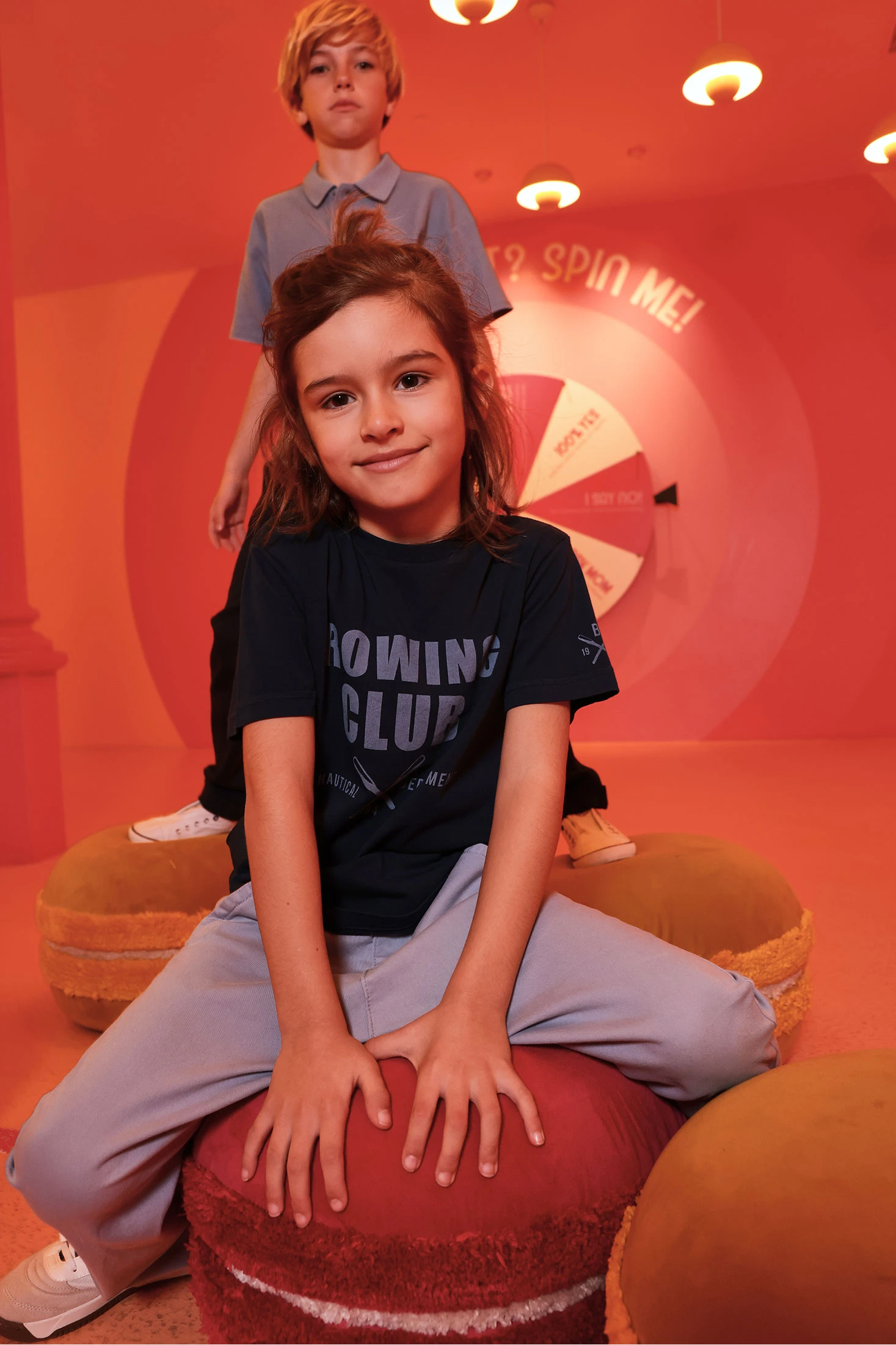Camiseta de algodón azul marino para niño perfecta para el día a día. Su diseño presenta un estampado de texto con remos cruzados, dándole un toque náutico moderno. Ideal para niños desde 2 a 14 años, está confeccionada en un material suave que asegura comodidad y frescura. El cuello redondo y las mangas cortas hacen que sea una prenda versátil, fácil de combinar con jeans o shorts, adecuada para cualquier ocasión casual. Un básico imprescindible para añadir estilo y practicidad al guardarropa infantil.