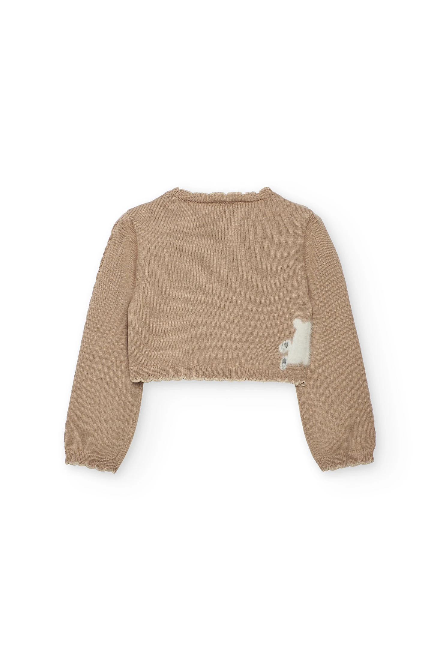 Chaqueta de punto para bebé en color beige, ideal para mantener a los pequeños abrigados durante el otoño e invierno. Confeccionada en un material suave que garantiza comodidad durante todo el día e incluye un encantador detalle de animal en la parte frontal, añadiendo un toque lúdico y ameno. Cierre de botones al frente y mangas largas aseguran un ajuste perfecto y práctico. Disponible en tallas desde de 12 meses a 10 años, se combina fácilmente con faldas o pantalones para un look cálido y elegante cualquier día.