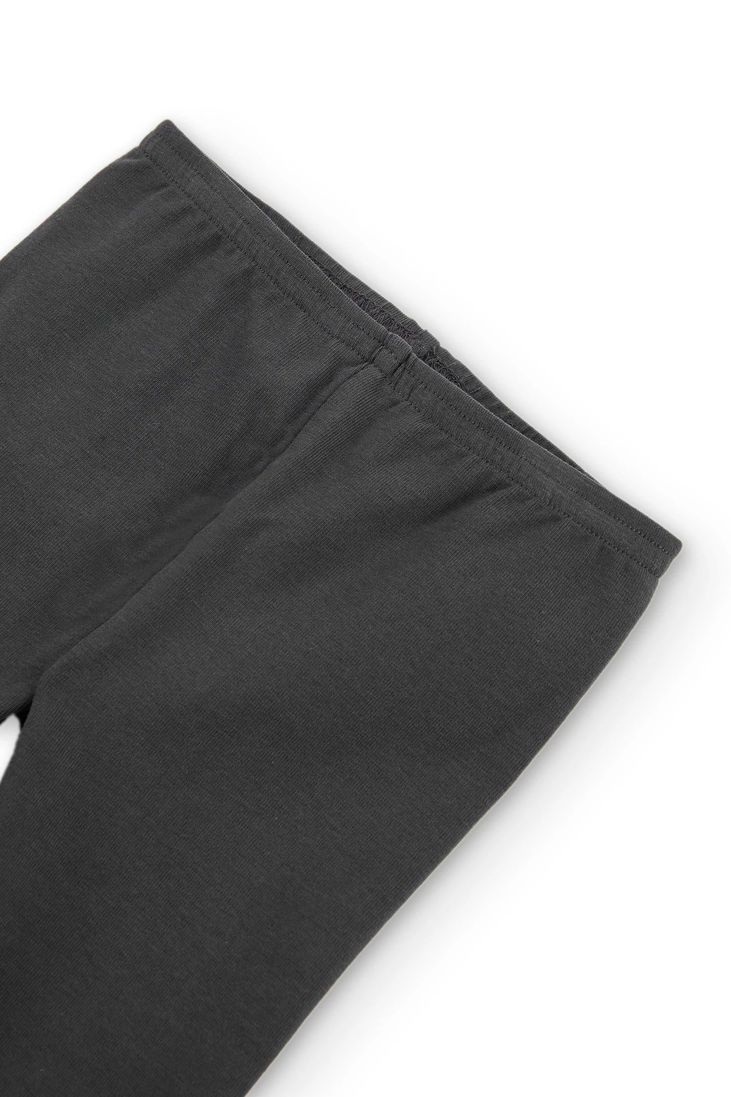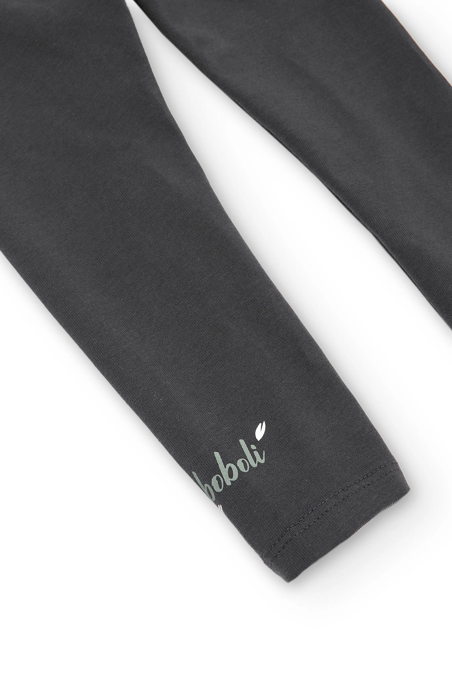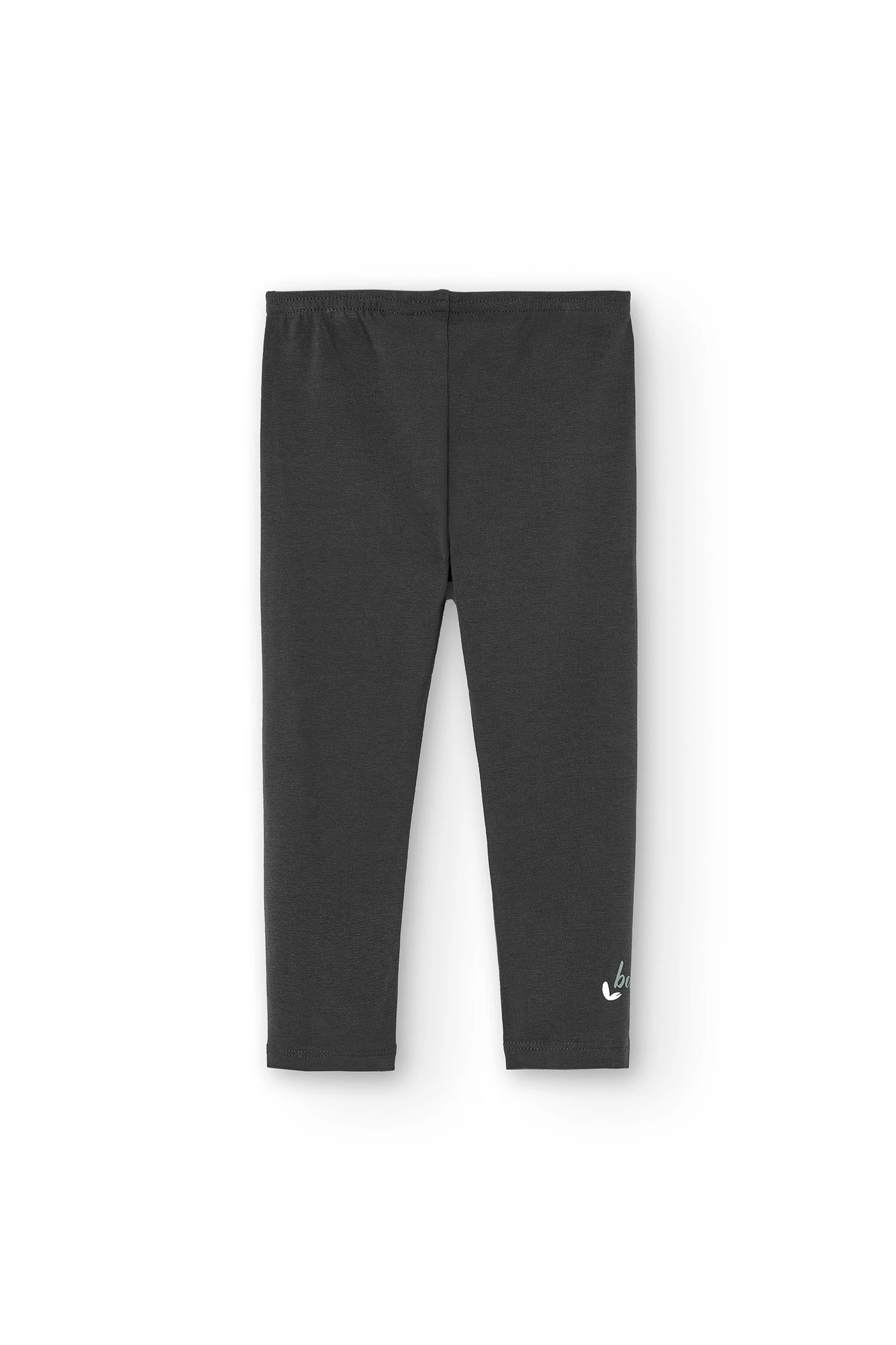 Leggings de punto elástico de niña en color gris oscuro, se ajusta con goma. La decoración es un pequeño estampado en varios colores con detalle de la marca. Disponible de la talla 6 meses a 6 años.