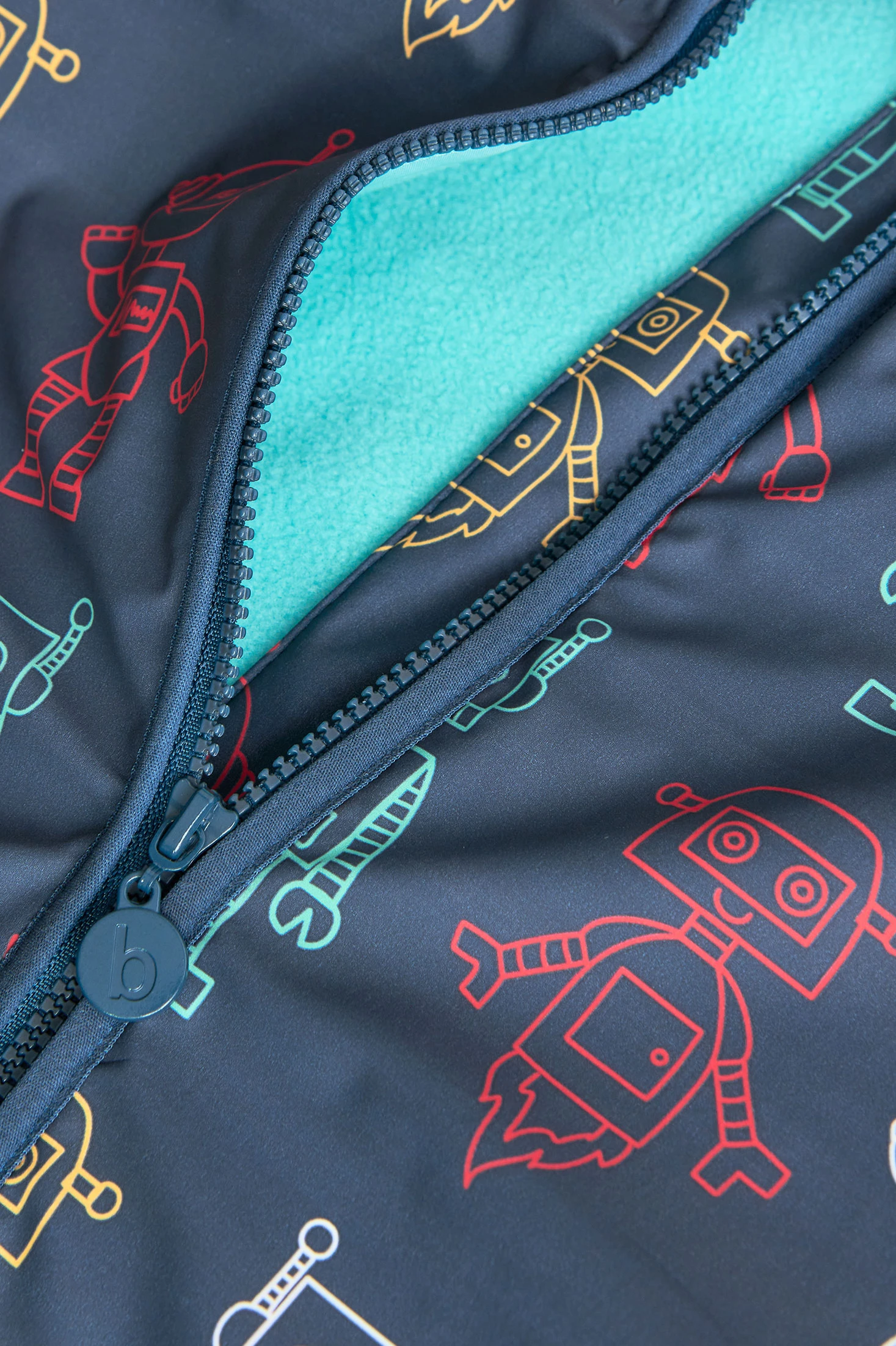 Este es un impermeable con un divertido estampado de robots. Ideal para los meses de otoño e invierno, su tejido impermeable y mangas largas protegerán a tu pequeño del frío y la lluvia. La capucha, forrada y de color azul marino, añade un toque de estilo y funcionalidad. El cierre es de cremallera, fácil de usar para los niños. Disponible en tallas para edades de 2 a 12 años. Sin duda, una prenda práctica y atractiva para los días de mal tiempo.