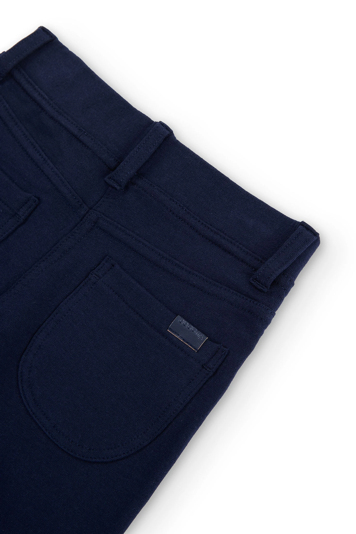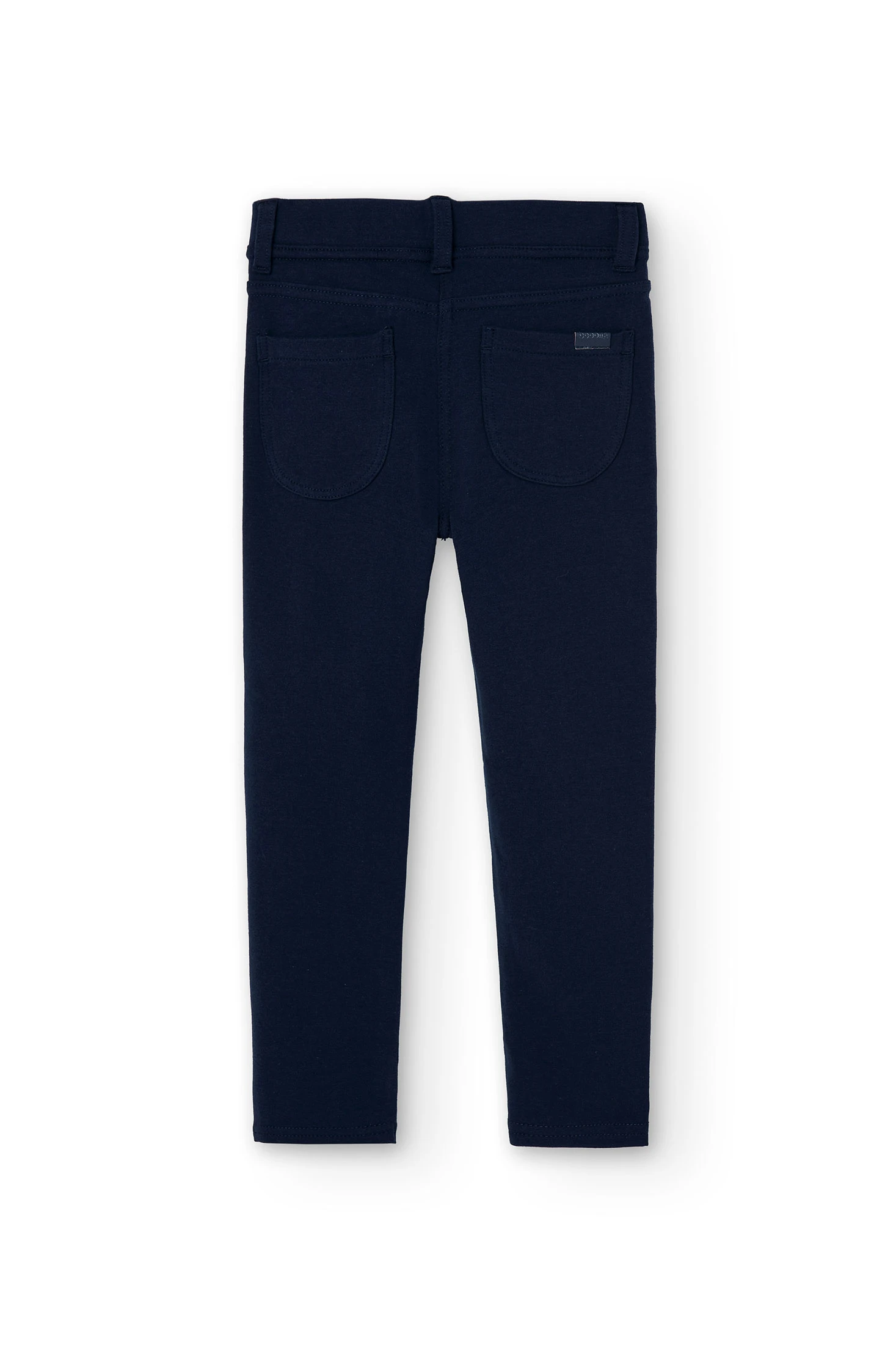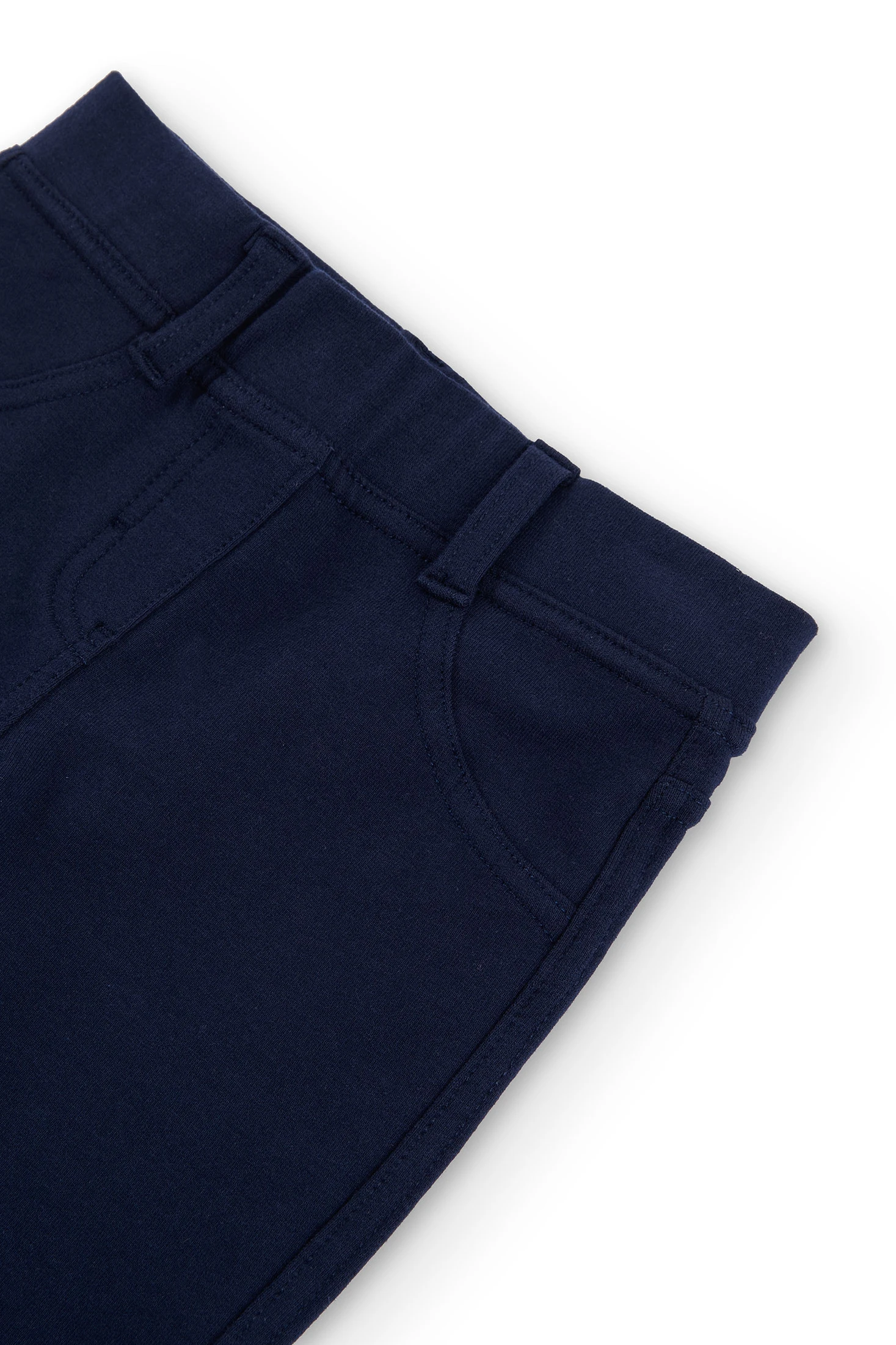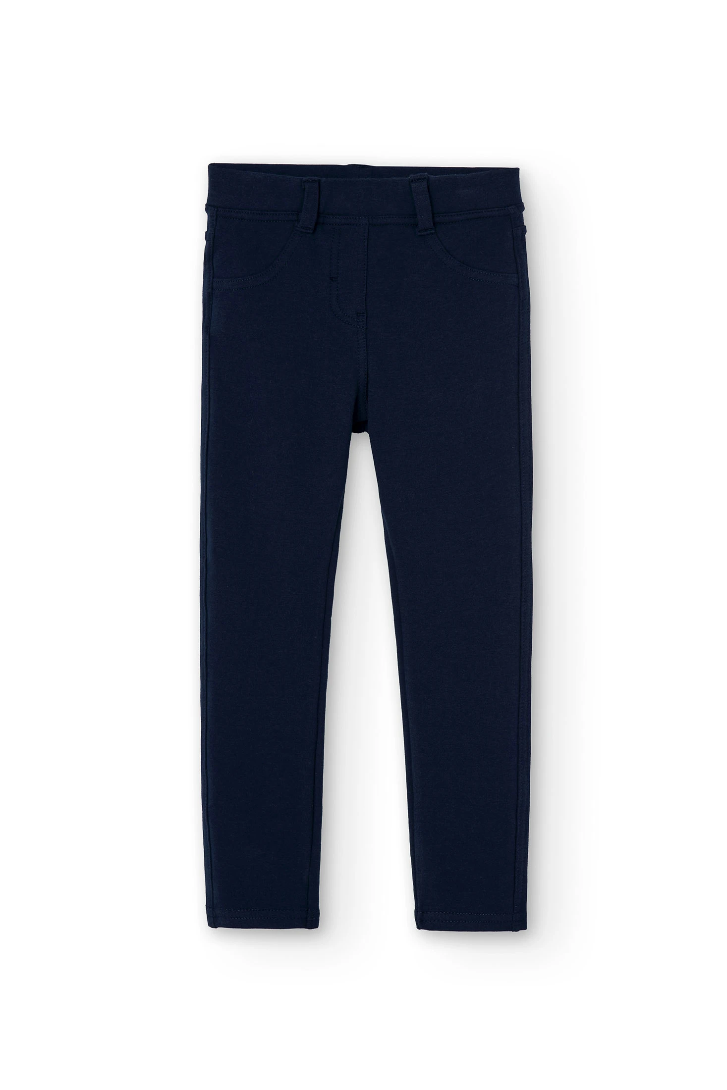 Pantalón de felpa elástica de niña en color marino, se ajusta con goma, los bolsillos delanteros y bragueta son de adorno. La decoración es una etiqueta con detalle de la marca. Disponible de la talla 4 años a 16 años.