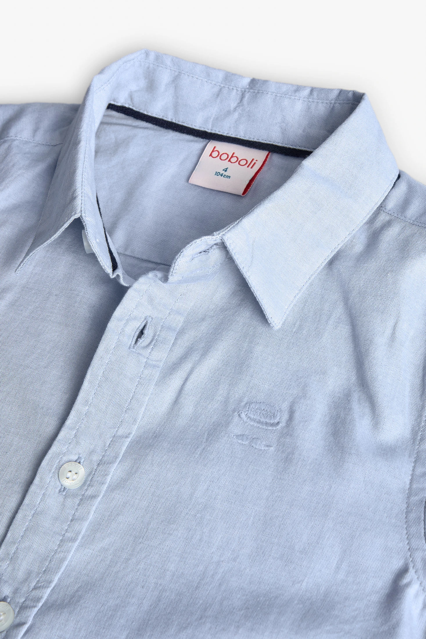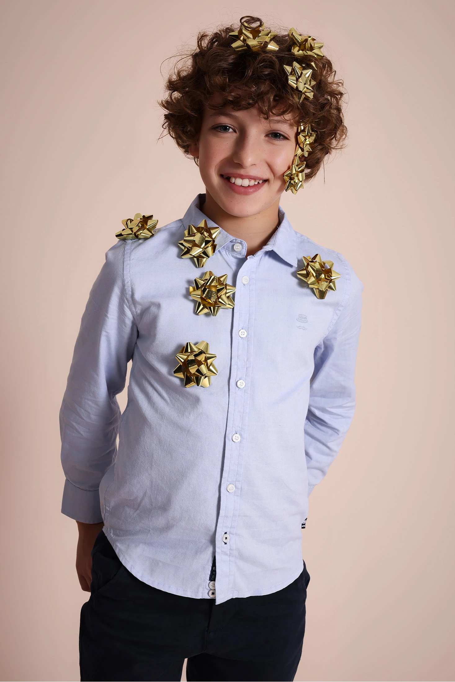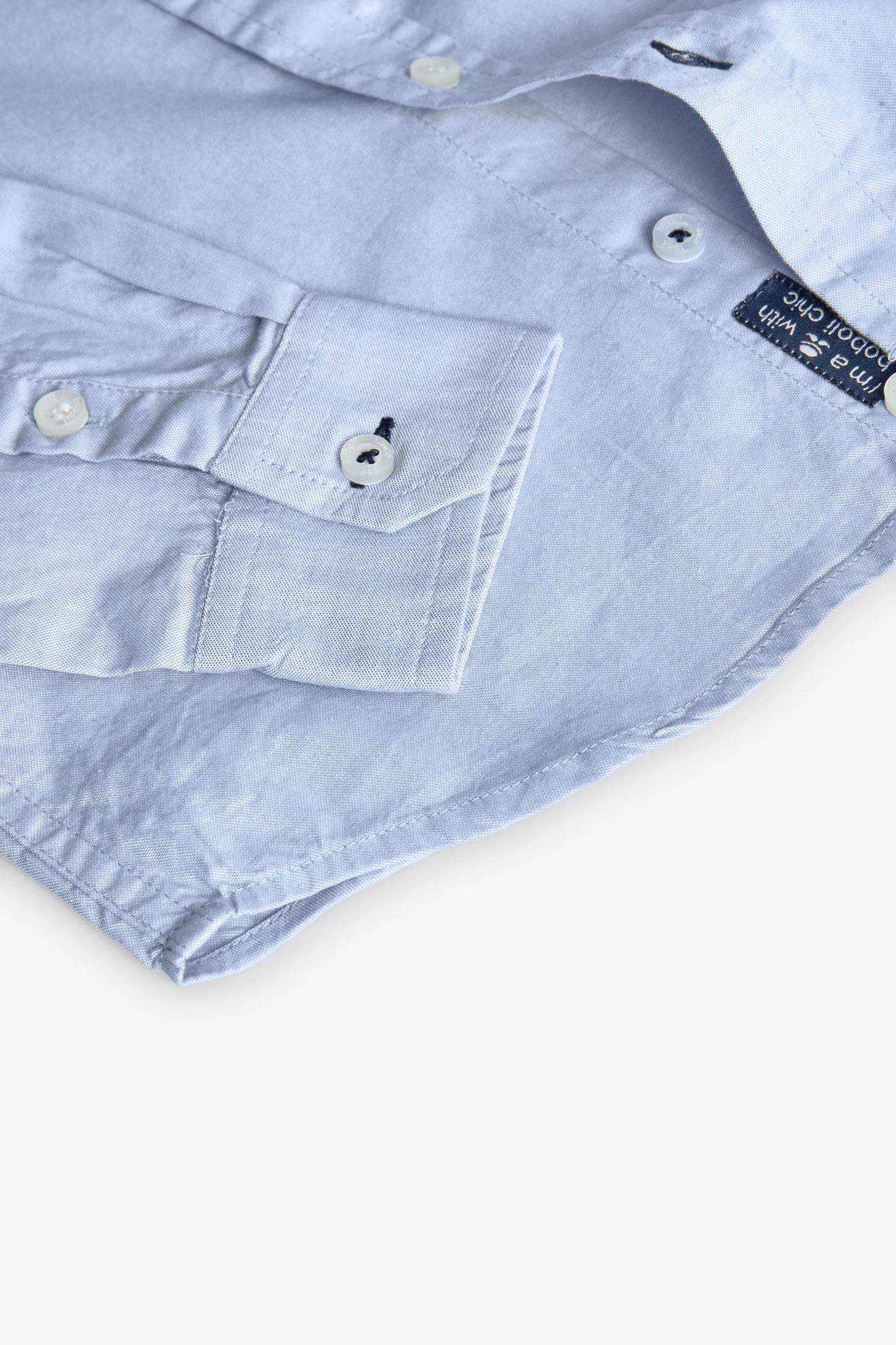 Esta es una camisa de oxford para niño en un atractivo color celeste, ideal para la temporada de primavera y verano. Su tejido suave y ligero proporciona comodidad durante todo el día. La camisa cuenta con un bonito estampado de pequeñas piñas, añadiendo un toque divertido al diseño. Tiene un corte clásico con cuello y botones, lo que la hace adecuada tanto para ocasiones informales como más elegantes. Está disponible en un rango continuo de tallas para niños de 4 a 16 años, y es una excelente opción para combinar con pantalones cortos o chinos, garantizando un look fresco y estiloso.
